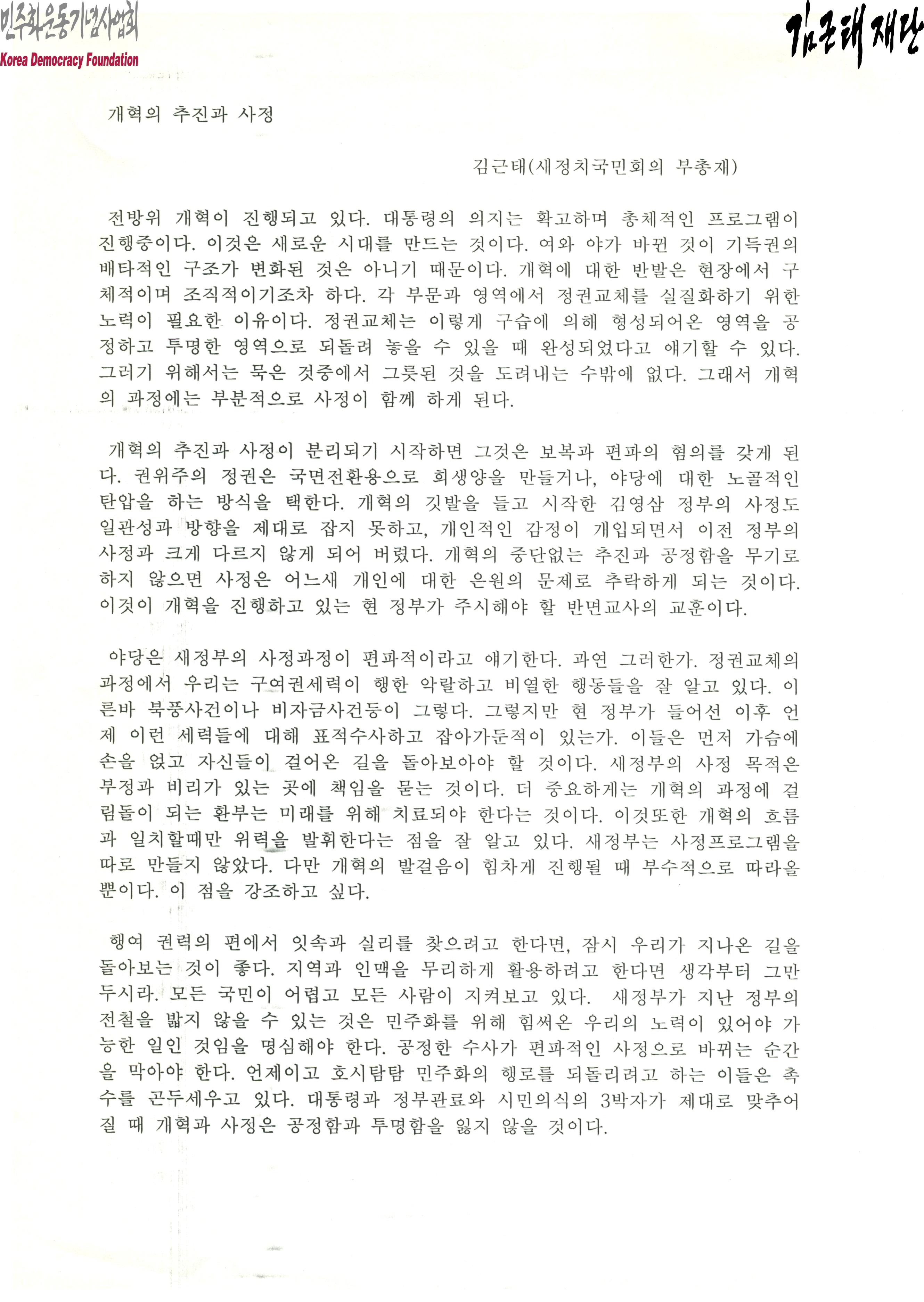 - 김근태가 개혁의 추진과 사정에 대해 작성한 문서로 정권교체는 구습에 의해 형성되어온 영역을 공정하고 투명한 영역으로 되돌려 놓을 수 있을 때 완성되었다고 얘기할 수 있으며 그러기 위해서는 묵은 것중에서 그릇된 것을 도려내는 수밖에 없다는 내용 등이 포함되어 있음