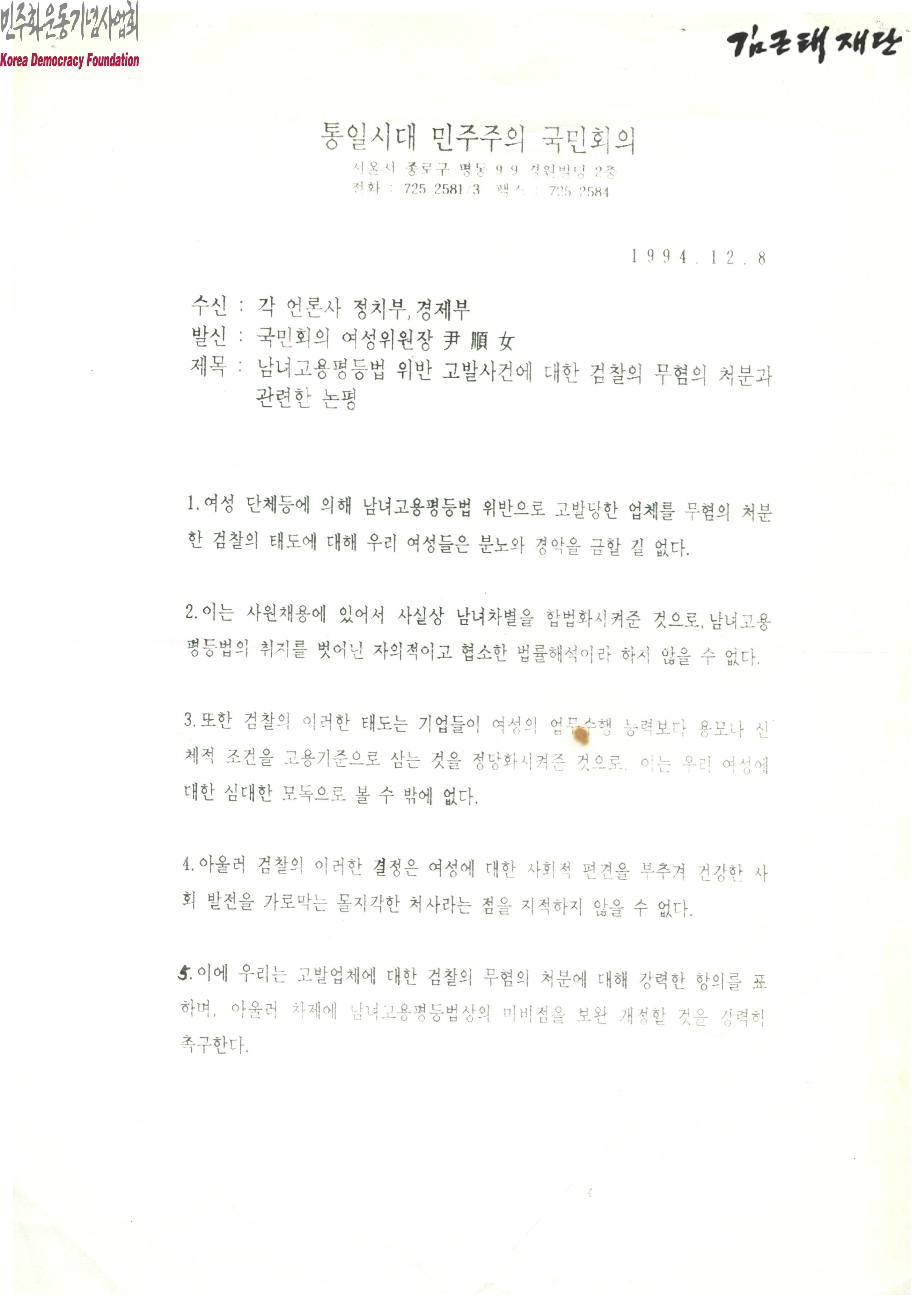 - 1994년 12월 8일 통일시대 민주주의 국민회의 여성위원장 윤순녀가 각 언론사 정치부, 경제부에게 보낸 논평문으로 남녀고용평등법 위한 고발사건에 대한 검찰의 무혐의 처분과 관련하여 작성하였음. 해당 논평문은 남녀고용평등법 위반으로 고발당한 업체를 무혐의 처분한 검찰에 태도에 비판과 항의를 하며 남녀고용평등법상의 미비점을 보완 개정할 것을 촉구하였음