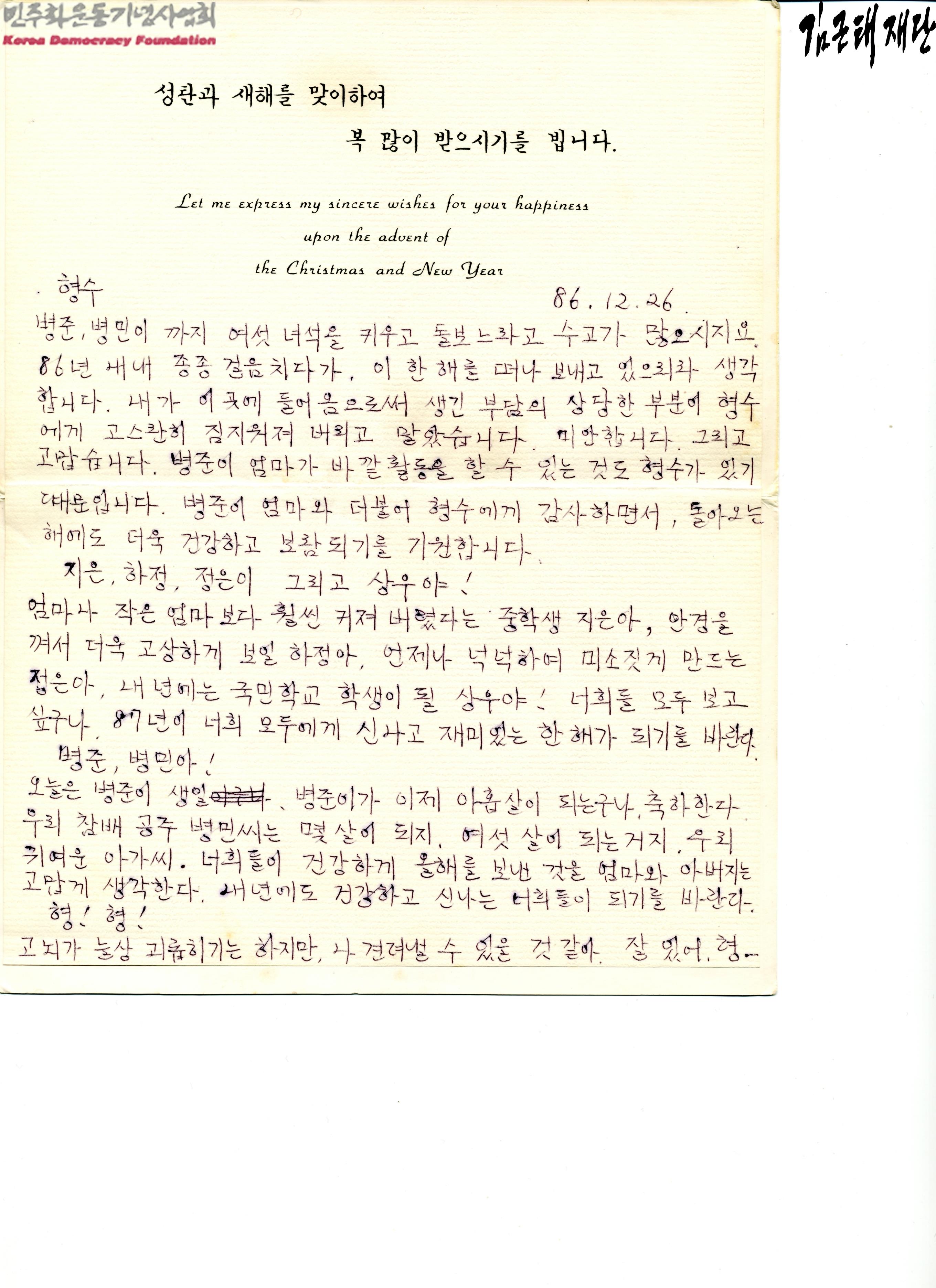 [1986년 12월 26일 김근태가 강릉교도소에서 가족들에게 보낸 서신]