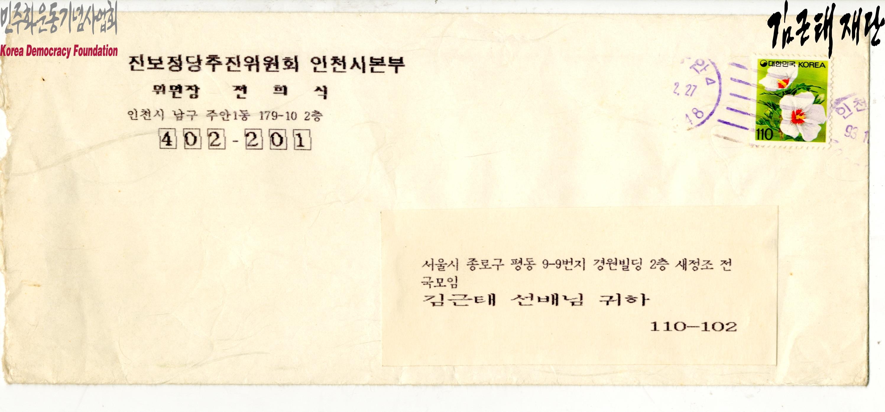 - 1993년 12월 27일에 전희식 진보정당추진위원회 인천시본부 위원장이 김근태에게 보낸 연하장으로 지난 한해 관심과 정성을 보여주신대에 감사드리며 새해 하고자 하는 일 다 이루시기 바란다는 내용이 적혀 있음. 연하장은 봉투에 적혀 있음