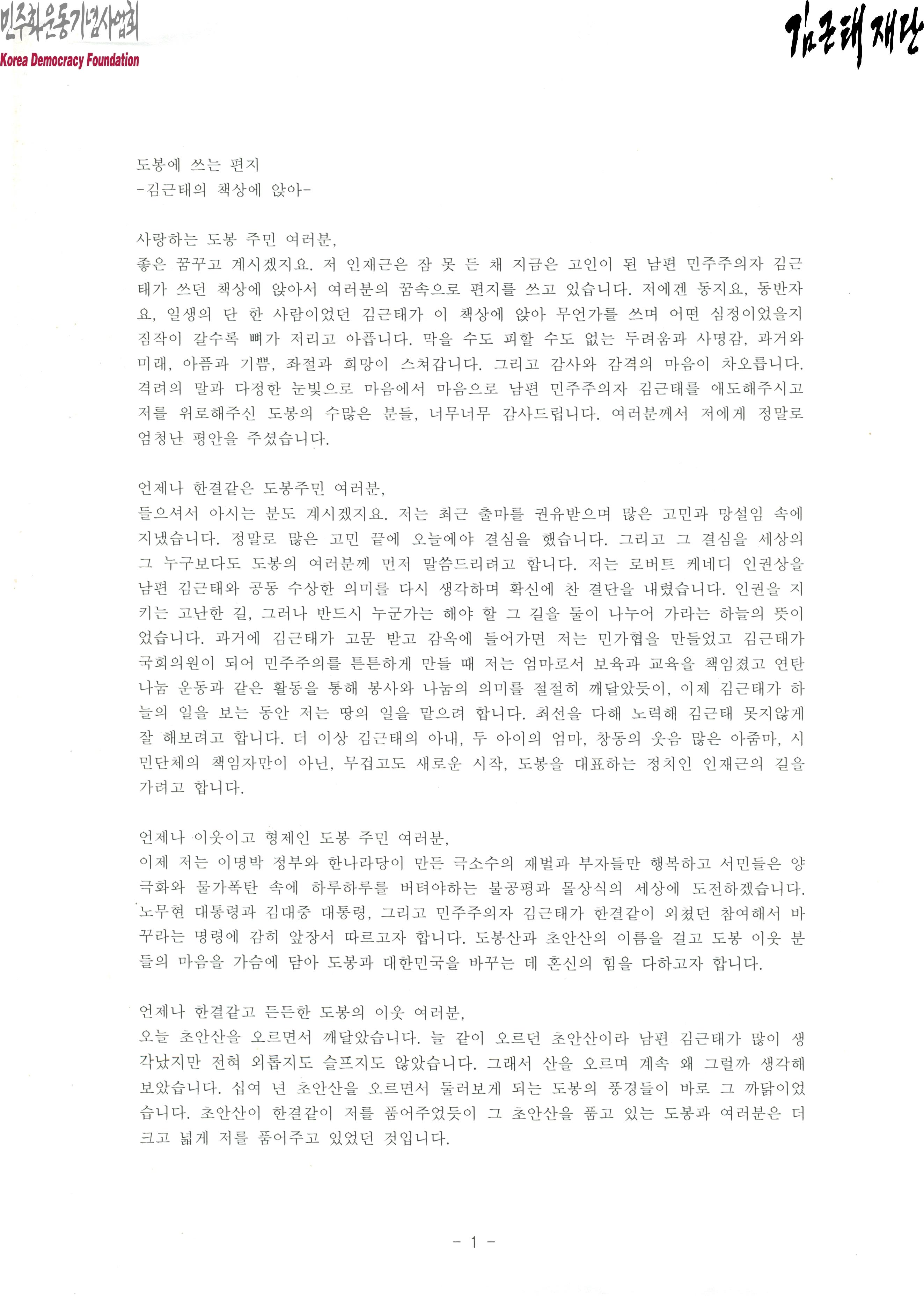 - 2012년 2월 인재근이 도봉 주민에게 보내는 서신으로 도봉을 대표하는 정치인 인재근으로서의 길을 가고자 하는 결단을 밝히는 내용과 감사함을 전하는 내용이 포함되어 있음
