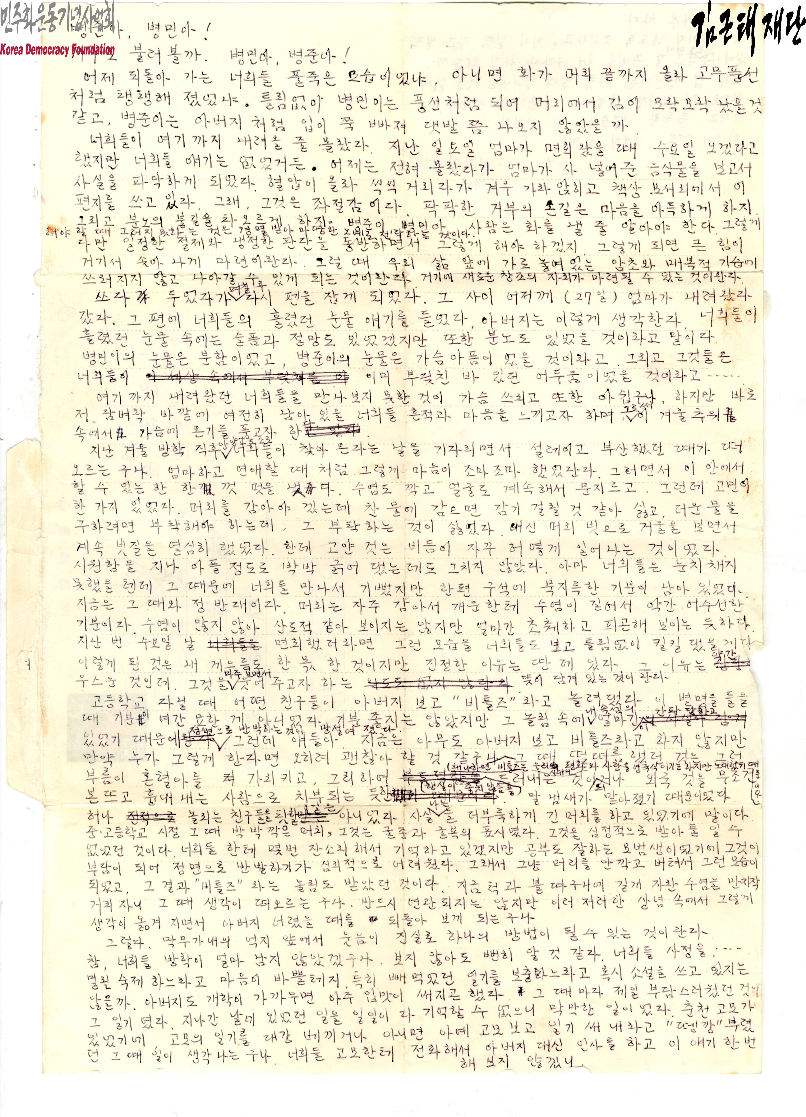 [홍성에서 수감생활중인 김근태가 자녀 김병민, 김병준에게 보내는 서신]