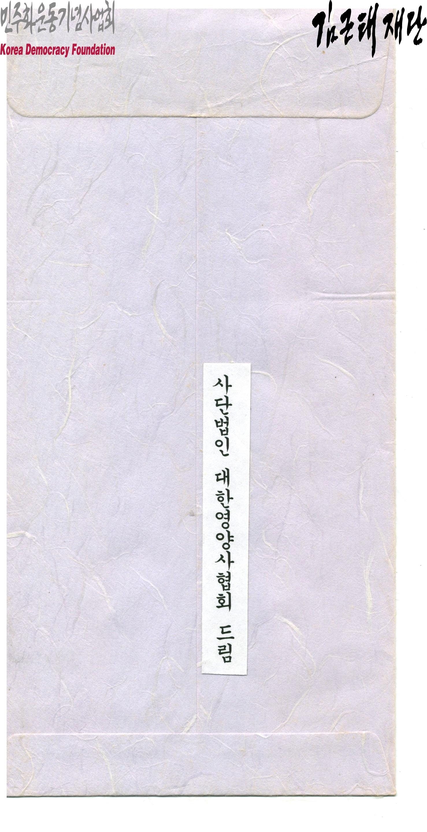 - 2005년 8월 대한영양사협회 회장 양일선이 김근태에게 보내는 서신과 편지봉투로 서신에는 장관 김근태의 안부와 지난 8월 18일 ''건강사회의 리더 : 영양사의 도전과 사명'' 이라는 주제로 개최한 ''2005년도 전국양양사학술대회''에 참석해 행사를 빛내주시고 좋은 발표를 해주심에 감사하며, 김근태의 발표는 저출산 · 고령사회에서 영양사들이 영양문제에 대해 역할과 책임 뿐 아니라, 국민의 한 사람으로서 사회적 역할과 책임에 대해 생각해 볼 수 있는 의미있는 시간이였다 등의 내용이 포함되어 있음