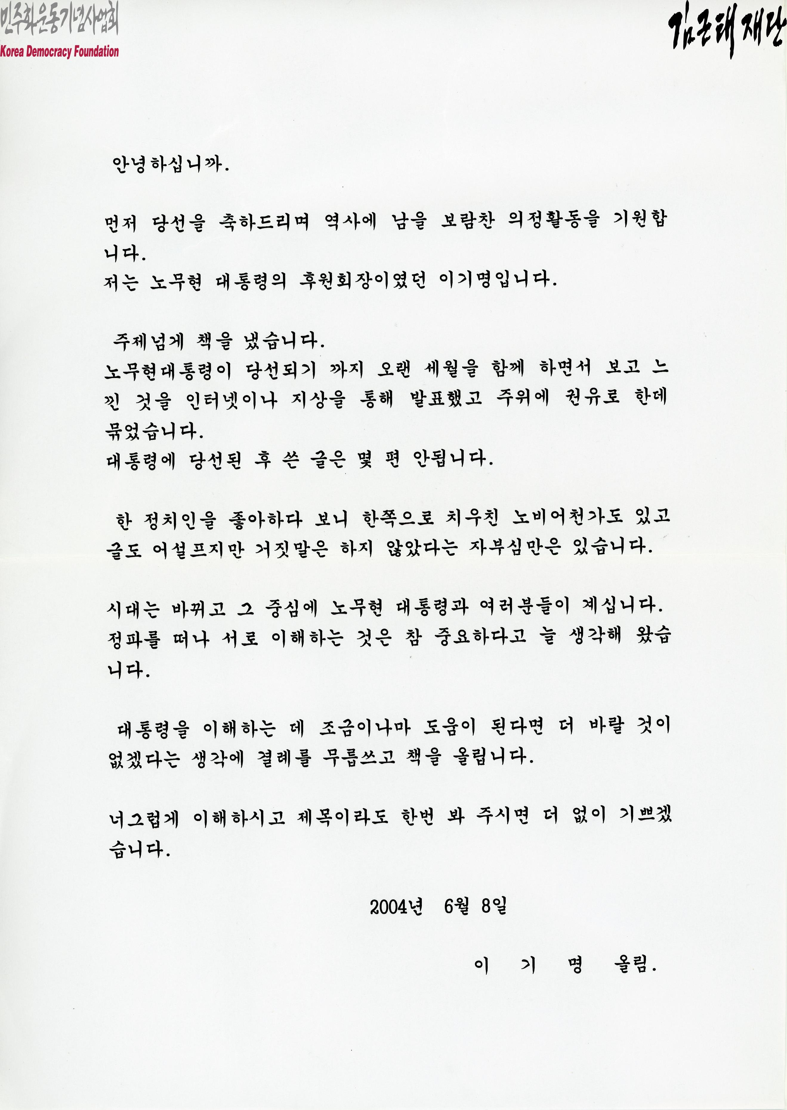 - 2004년 6월 8일 이기명이 작성한 서신으로 자신이 노무현 대통령의 후원회장이었다는 사실을 밝히는 내용과 역사에 남을 보람찬 의정활동을 기원한다는 내용 등이 포함되어 있음