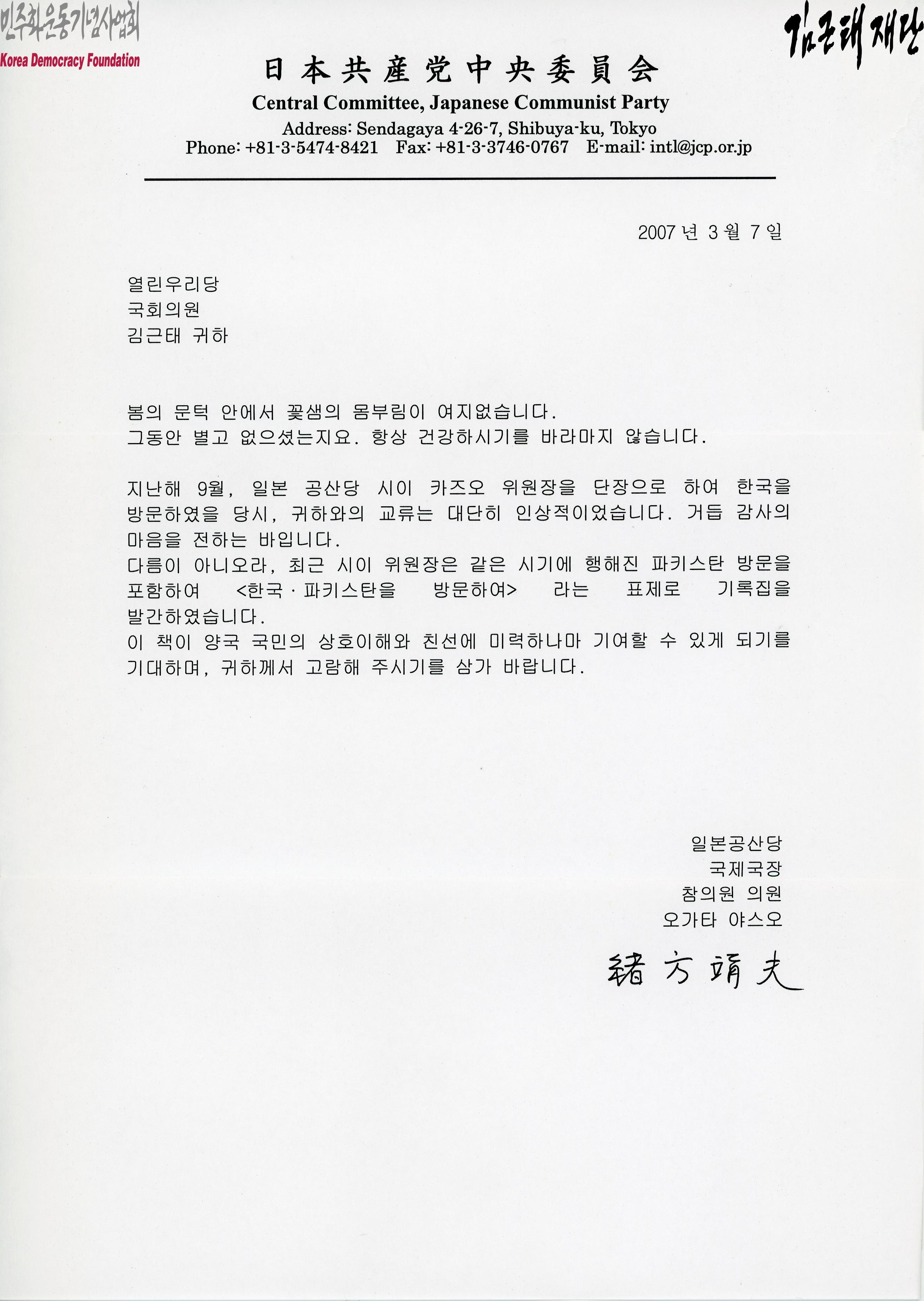 [''2007년 3월 7일 일본공산당 국제국장 참의원 의원 오가타 야스오가 김근태에게 보낸 서신]