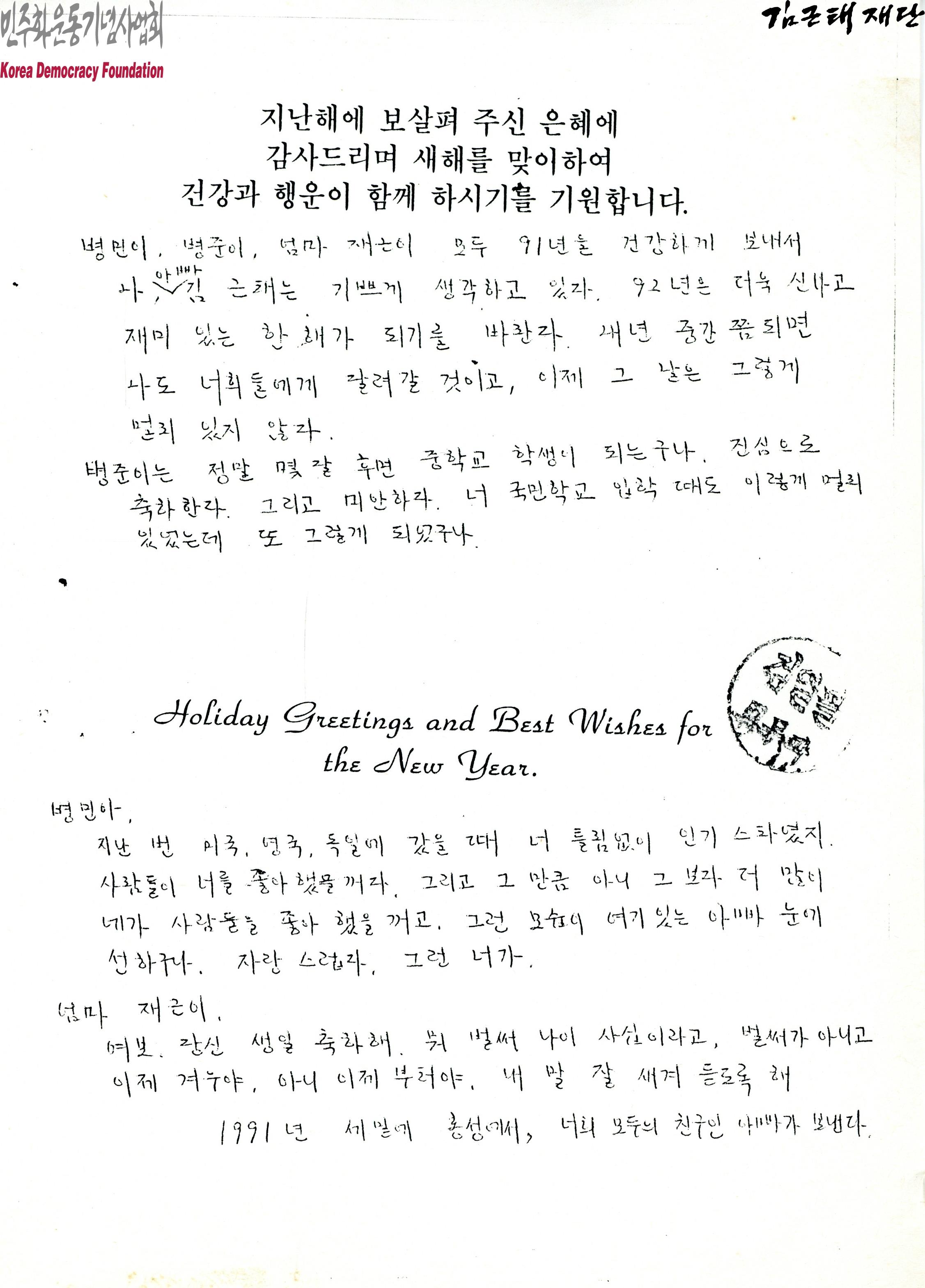 병민이, 병준이, 엄마 재근이 모두[1991년에 김근태가 김병민, 김병준, 인재근에게 보낸 서신의 사본]