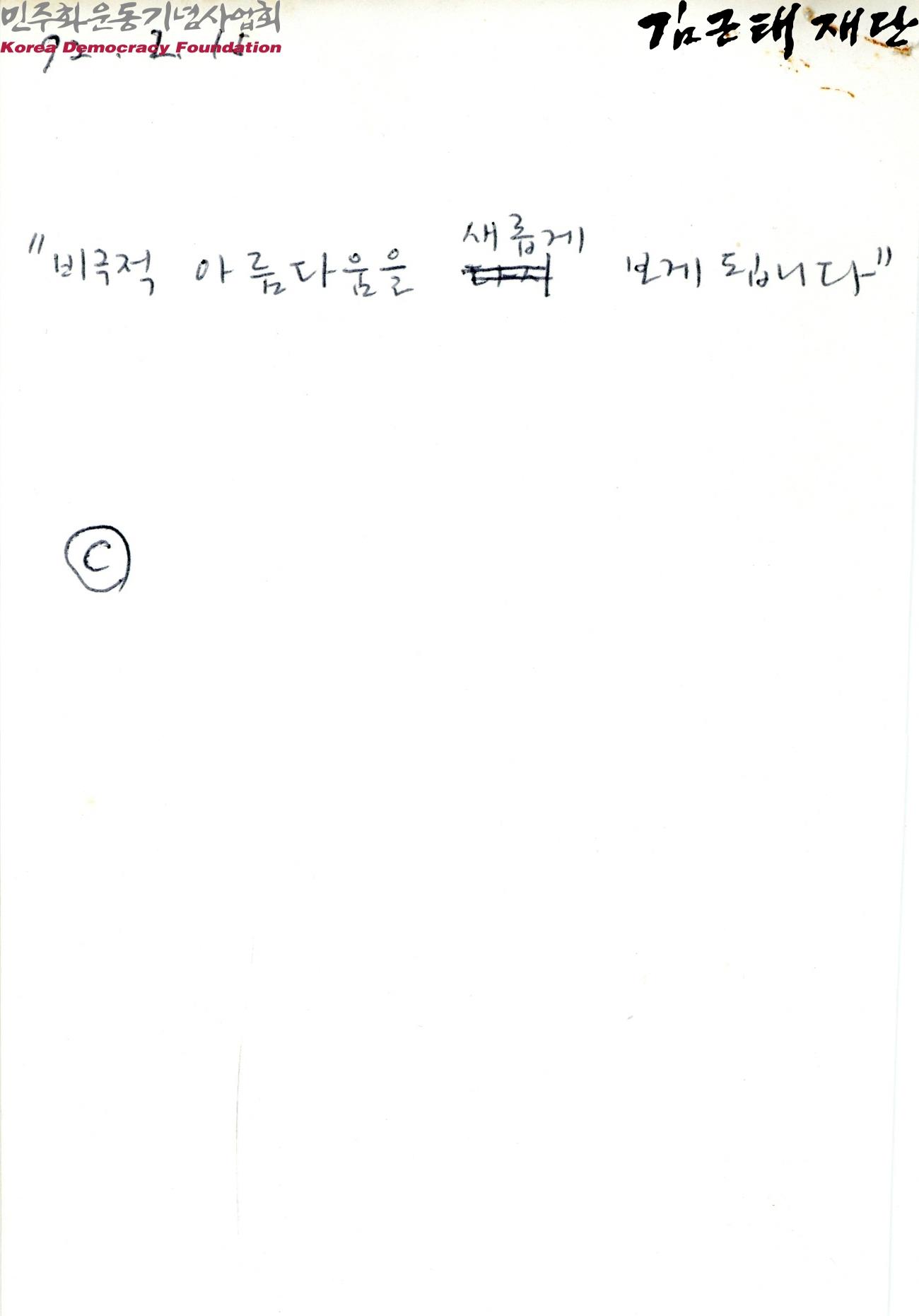 - 1992년 2월 15일에 홍성에서 김근태가 강연균에게 보낸 편지의 사본. 김병민이 강연균의 그림을 좋아한다는 내용, 한국민족예술인총연합의 공동의장을 맡기로 한 강연균의 노고를 치하하는 내용이 적혀 있음. ''검열필'' 도장이 찍혀 있음. 편지 날짜와 중요 내용, ''C''라고 자필로 적힌 종이가 첨부되어 있음