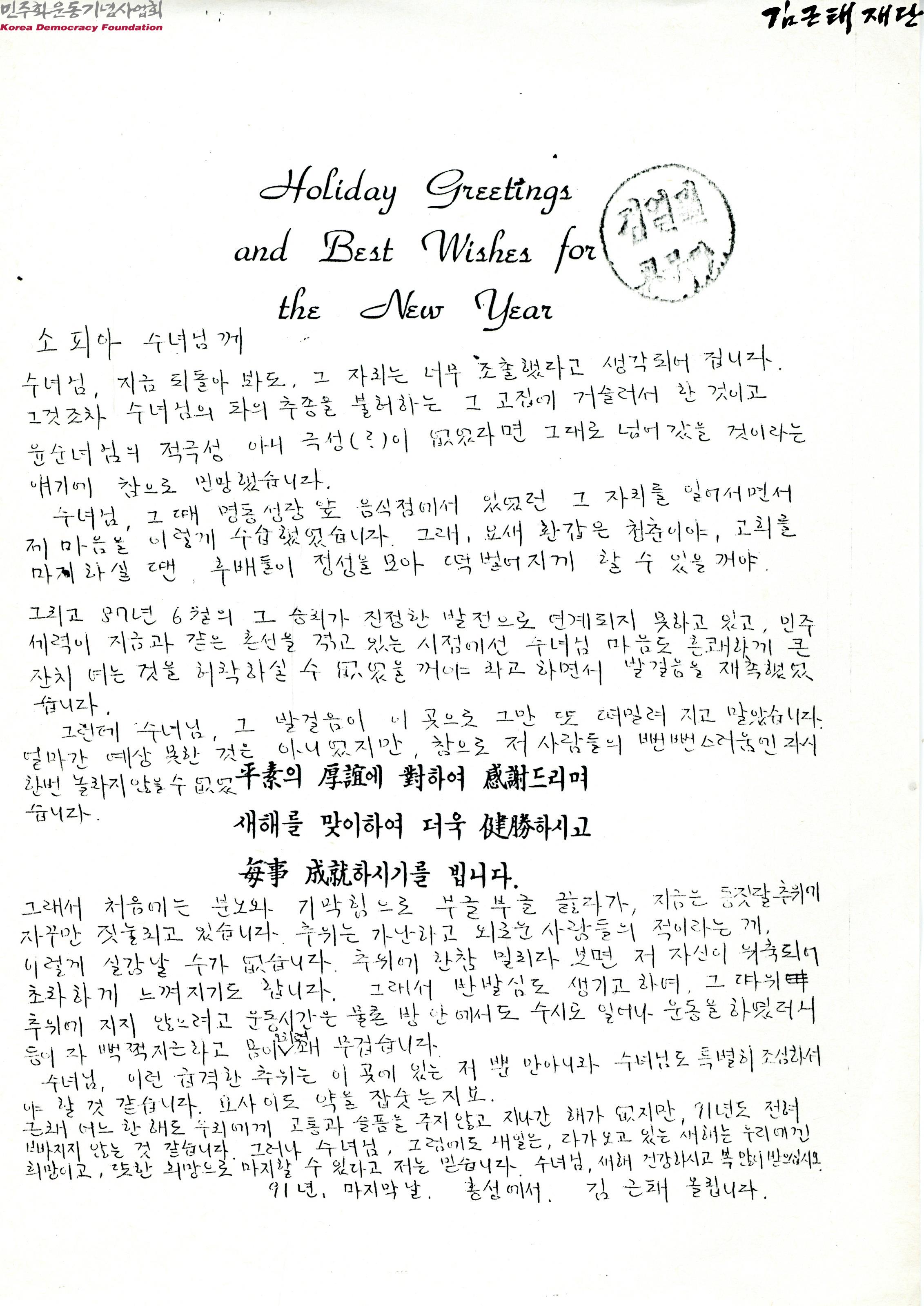 [1991년 12월 31일에 김근태가 소피아에게 보낸 서신의 사본]