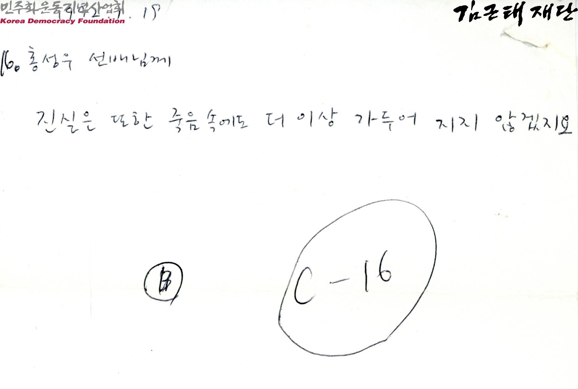 - 1992년 1월 19일에 홍성에서 김근태가 홍성우에게 보낸 편지의 사본. 동료인 영태의 죽음을 슬퍼하는 홍성우의 편지에 대한 답장으로 고된 상황에서도 다시 기운 차릴 것을 격려하는 내용이 적혀 있음. ''검열필'' 도장이 찍혀 있음. 편지 날짜와 중요 내용, ''C-16''이라고 자필로 적힌 종이가 첨부되어 있음