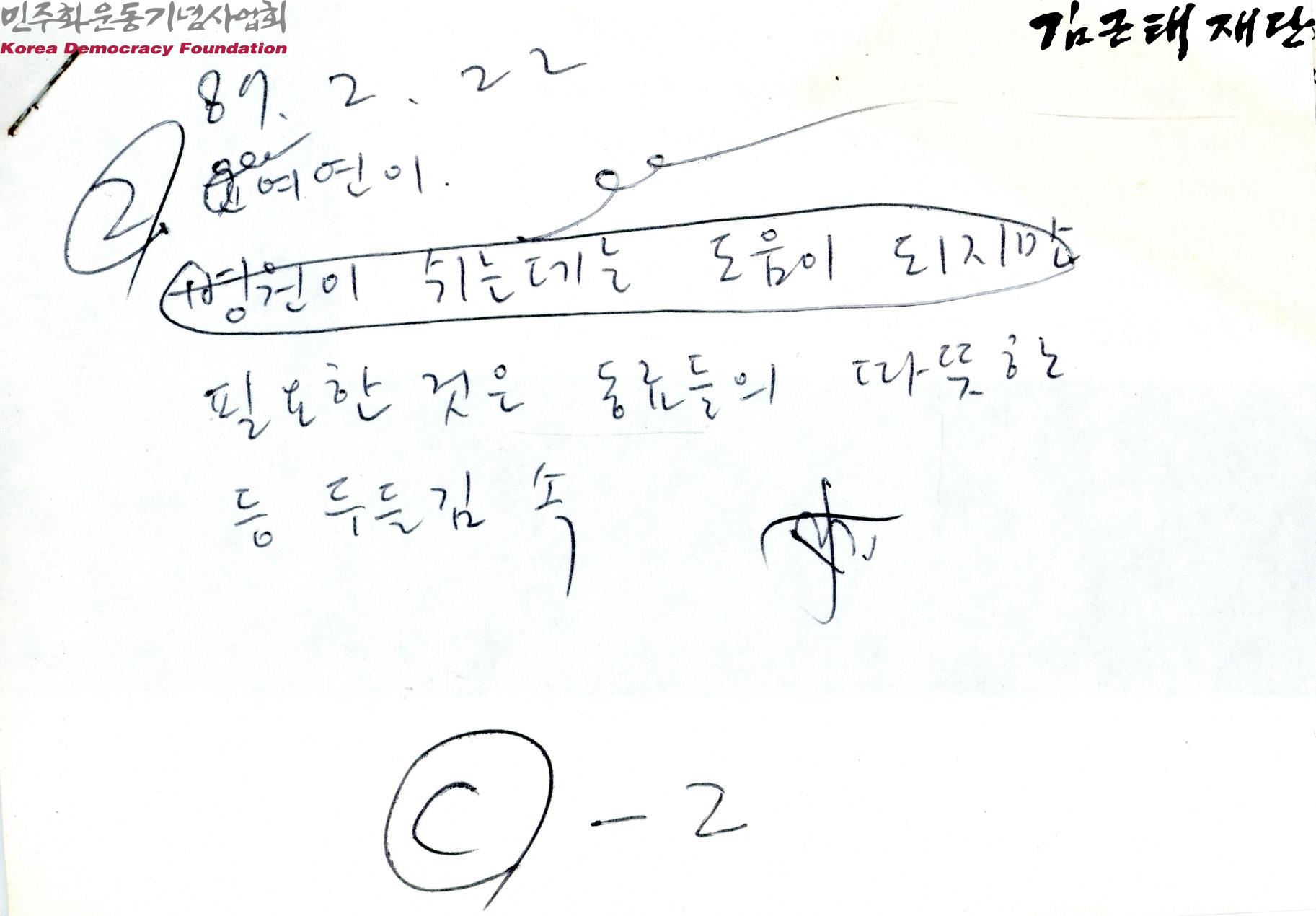 - 1987년 2월 22일에 경주에서 김근태가 윤여연에게 보낸 편지의 사본. 고문으로 인해 민주화 운동에서 은퇴하겠다고 말했던 자신을 혐오했던 경험을 이야기하며 고문으로 몸이 불편한 윤여연을 위로하는 내용이 쓰여 있음. 편지 날짜와 중요 내용, ''C-2''라고 자필로 적힌 종이가 첨부되어 있음