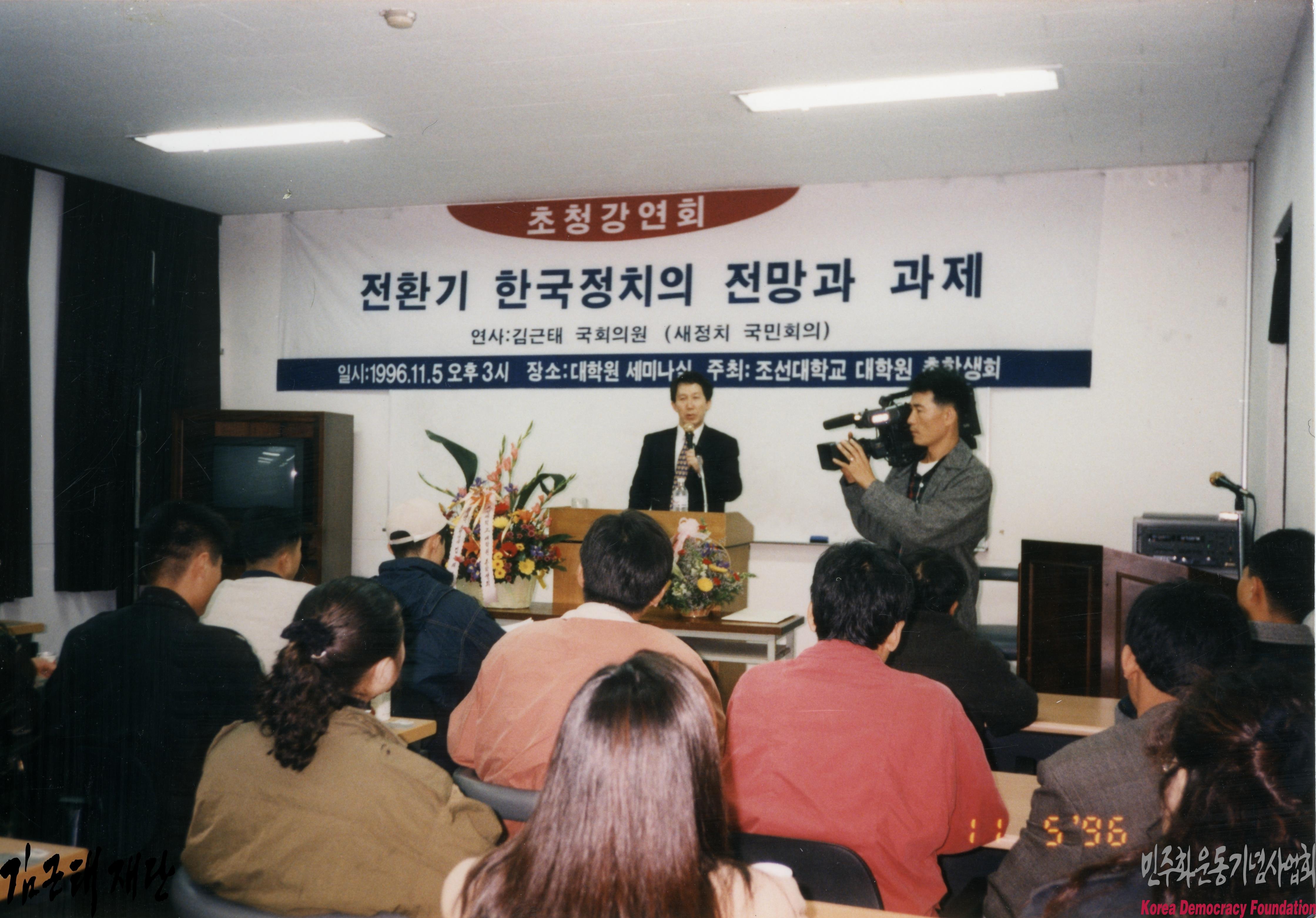 - 1996년 11월 5일 조선대학교 대학원 세미나실에서 열린 조선대학교 초청강연회에 강연을 하는 김근태의 모습이 담겨 있음