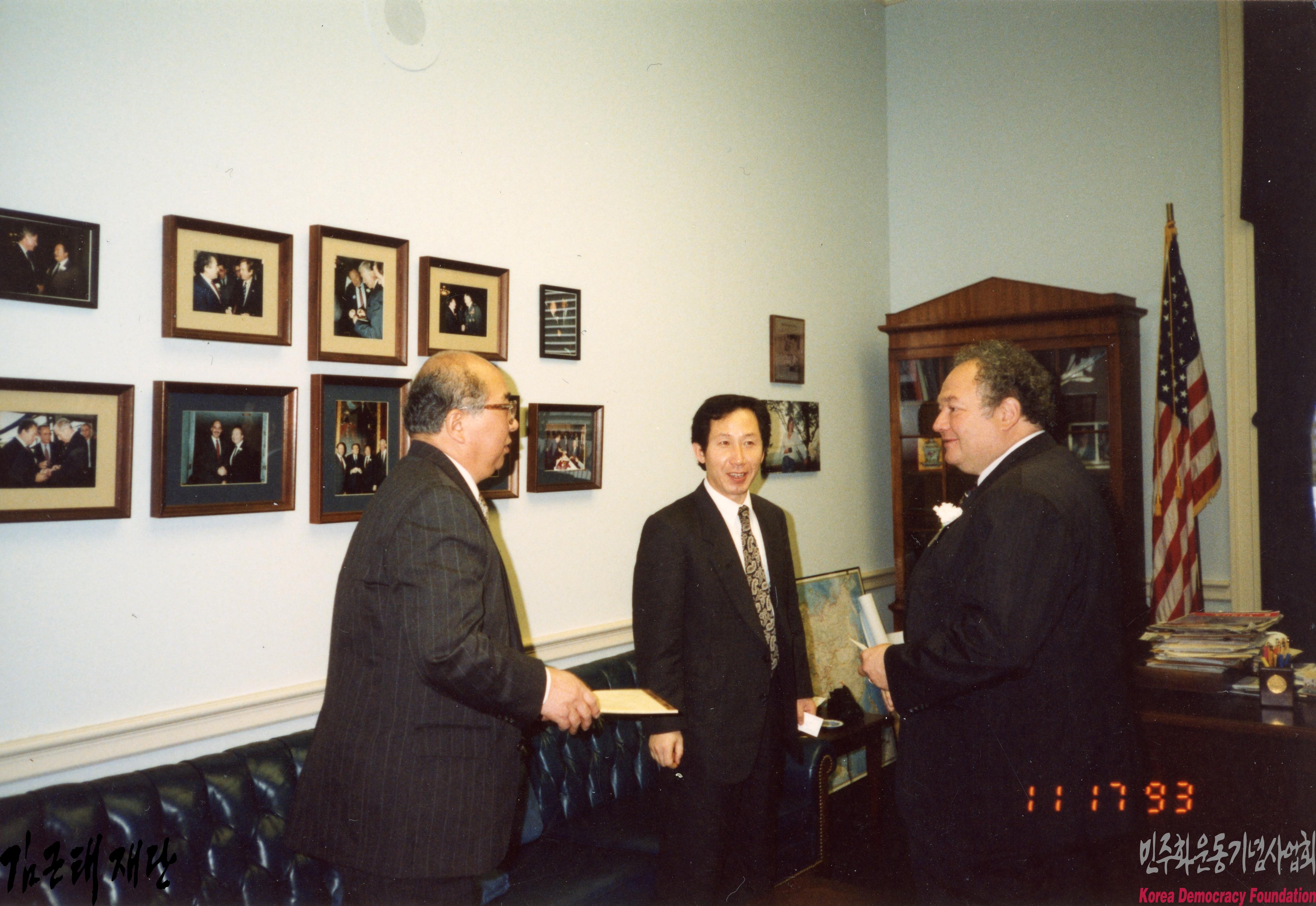 - 1993년 11월 17일 김근태와 미국 하원의원이 면담을 하는 모습이 담겨 있음. 김근태와 미국 하원의원이 함께 찍은 기념사진 등이 포함되어 있음
