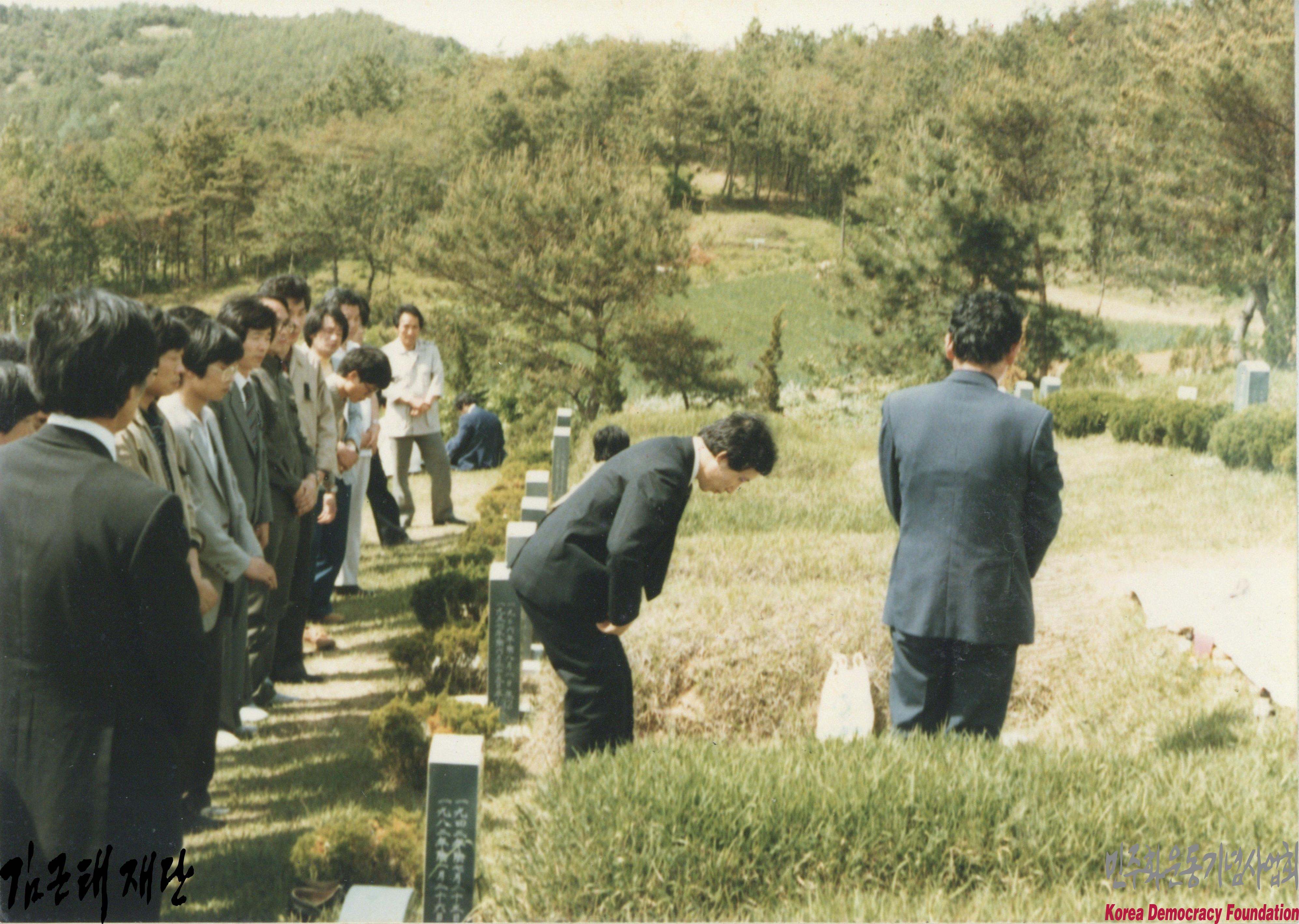 - 1984년 5월 김근태가 민주화운동청년연합 의장시절 출범 이후 민주세력으로는 첫번째로 5.18국립묘지에서 참배한 사진으로 오른쪽에서 두 번째 절을 하고 있는 인물이 김근태임