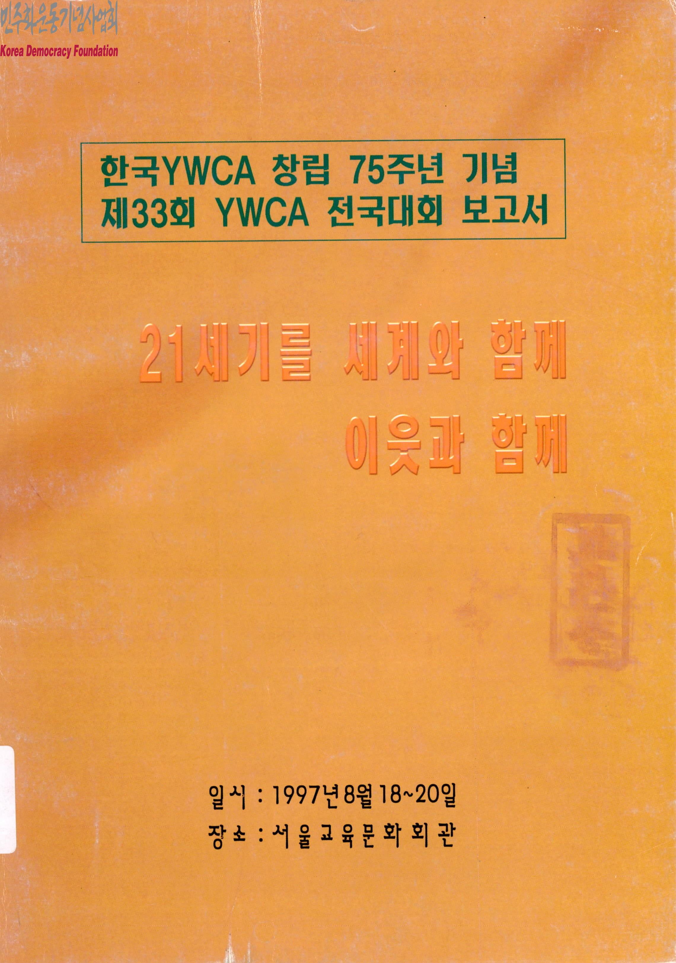 - 1997년 8월 18일부터 20일까지 대한YWCA연합회에서 한국YWCA 창립 75주년을 맞이해 주최한 제33회 YWCA 전국대회의 보고서로 대회 준비위원 안내, ''21세기를 여는 사고 틀의 전환''이라는 제목의 발제문 등이 포함되어 있음