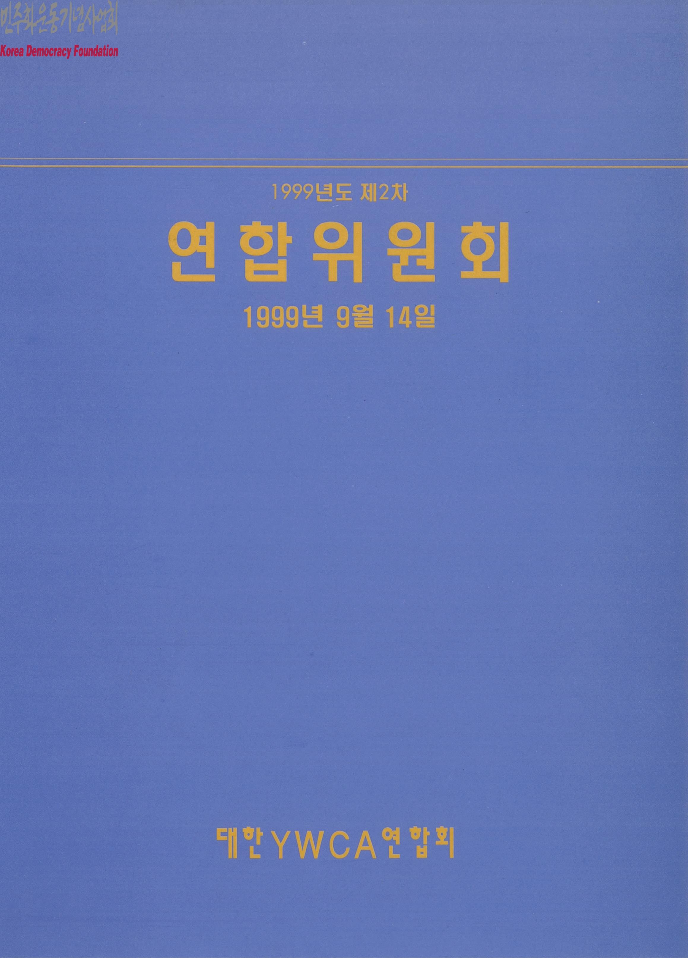 - 1999년 9월 14일 대한YWCA연합회에서 주최한 제2차 연합위원회의 자료집으로 YWCA세계대회 보고, 상주YWCA 회원자격 중지 및 거창YWCA준비회 활동승인 취소의 건, 밀레니엄 전국대회 바람직한 운영방안 등이 포함되어 있음