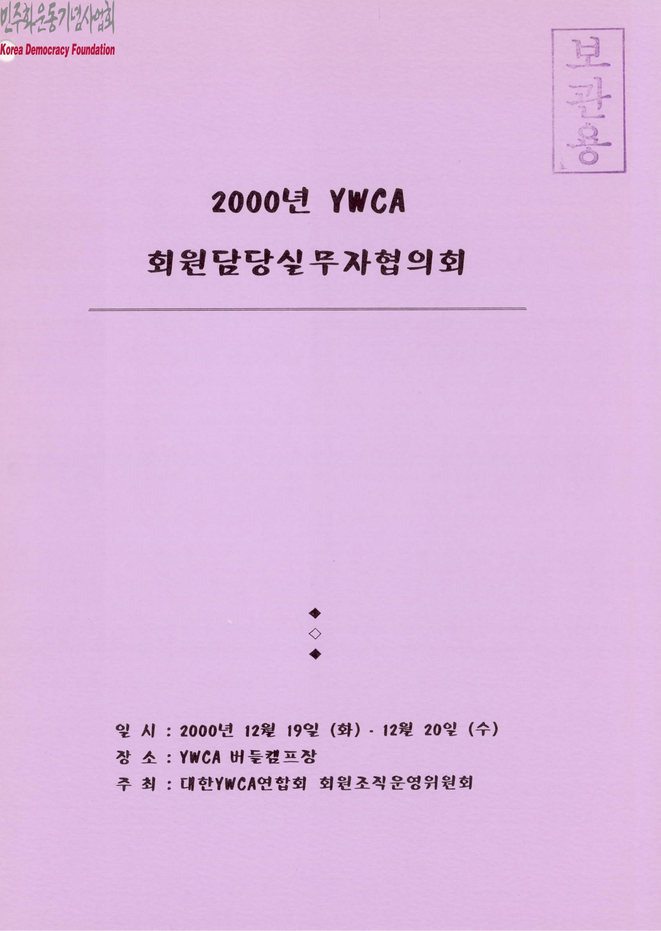 - 2000년 12월 19일부터 20일까지 대한YWCA연합회 회원조직운영위원회에에서 주최한 회원담당실무자협의회 자료집으로 어린이, Y-틴, 대학, 청년 회원 그룹별 워크샵 자료와 2001년 회원조직운영위원회 사업계획(안) 내용 등이 포함되어 있음 목차 1. 2000년 YWCA 회원담당 실무자 협의회 일정안내 / 1 2. 개회예배 / 3 3. <주제강연> YWCA 회원운동의 방향과 과제 / 7 4. <강의 1> 2001년 중점사업 : 평화통일 / 19 5. <강의 2> YWCA 회원운동 / 21 6. 그룹별 WORKSHOP / 22 1) 어린이 회원 담당 2) Y-틴 회원 담당 3) 대학 회원 담당 4) 청년 회원 담당 7. 폐회예배 / 23 8. 참고자료 1) 2001년 회원조직운영위원회 사업계획(안) / 28 2) 제34회 YWCA 전국대회 평화선언문 / 31 3) 제34회 전국대회 발제원고 / 32 9. 참가자 명단 / 34