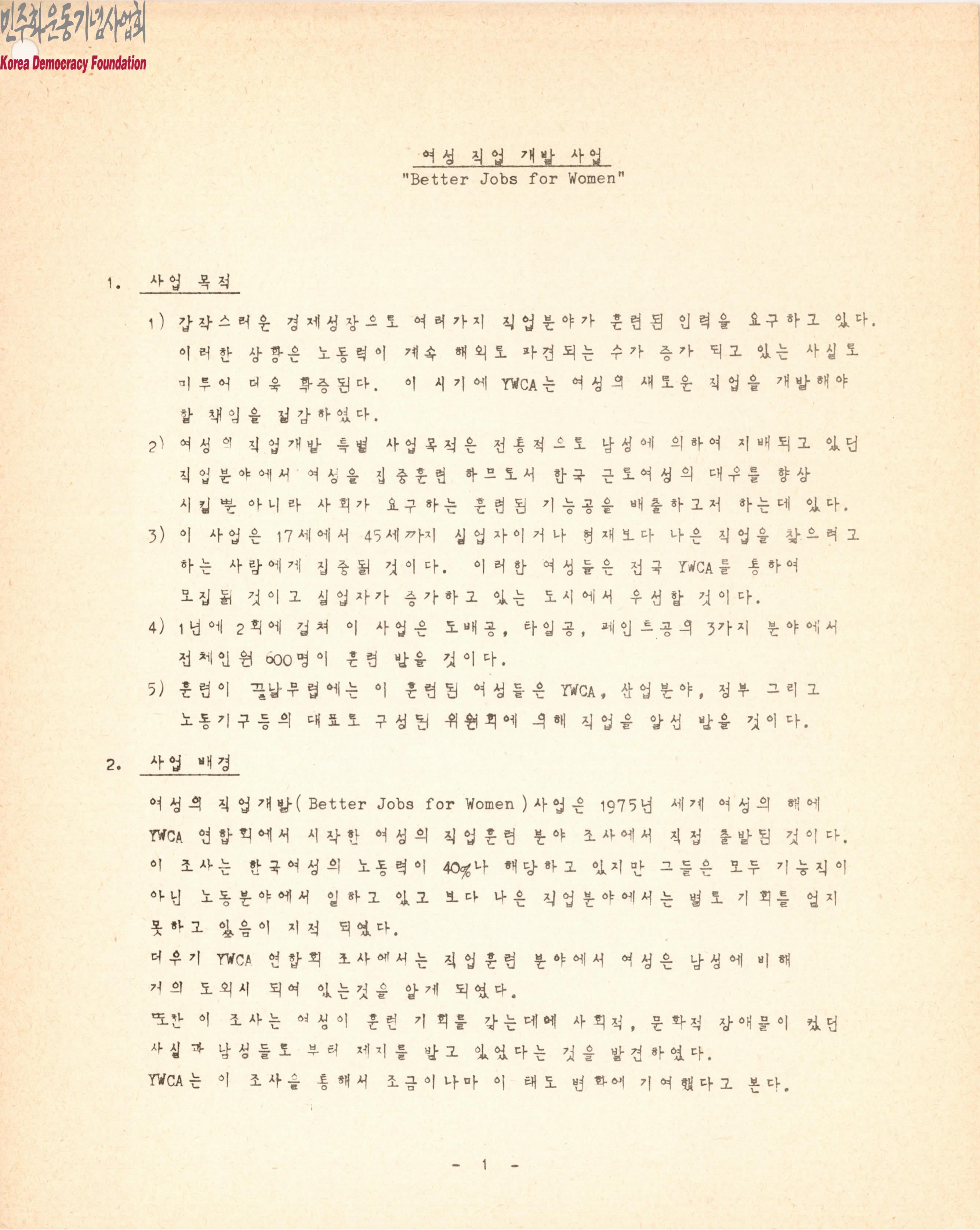 - 대한YWCA연합회에서 작성한 문서로 여성 직업 개발 사업에 대한 목적과 배경, 이에 대한 분석 등의 자료를 정리한 내용 등이 포함되어 있음