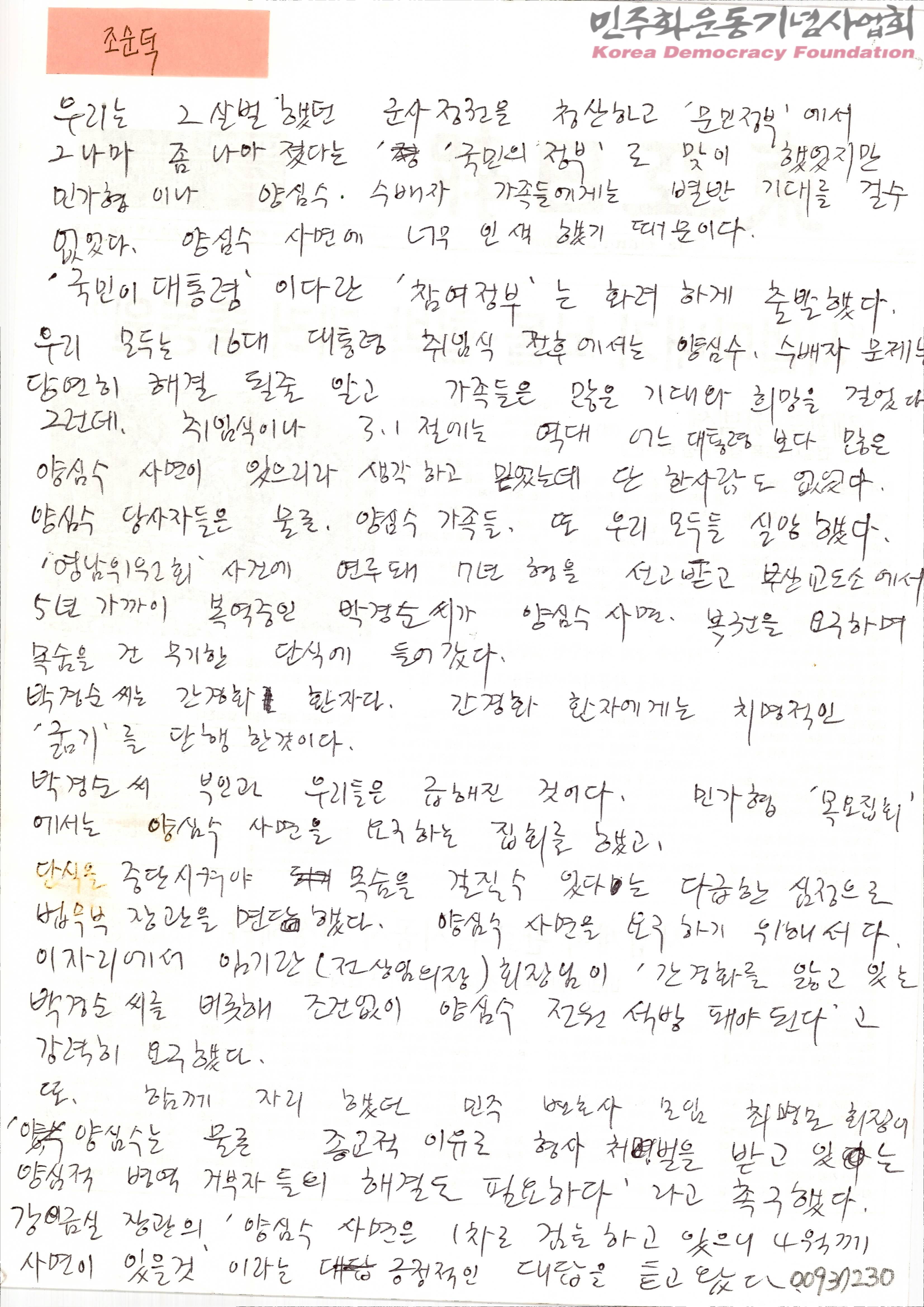 [양심수 사면 투쟁 관련 자필문서]