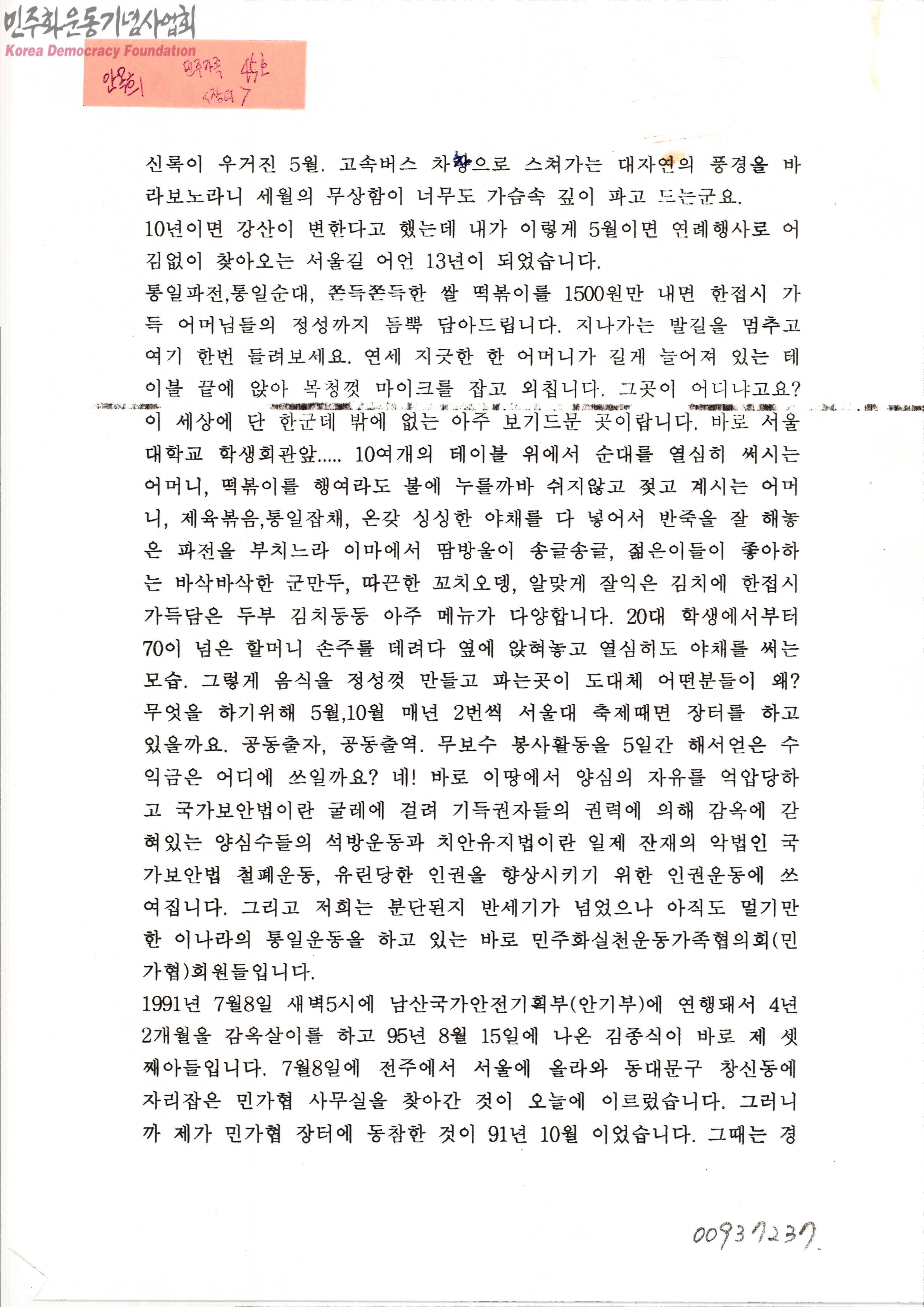 [민주가족 45호 <장터> 안옥희의 자필원고]