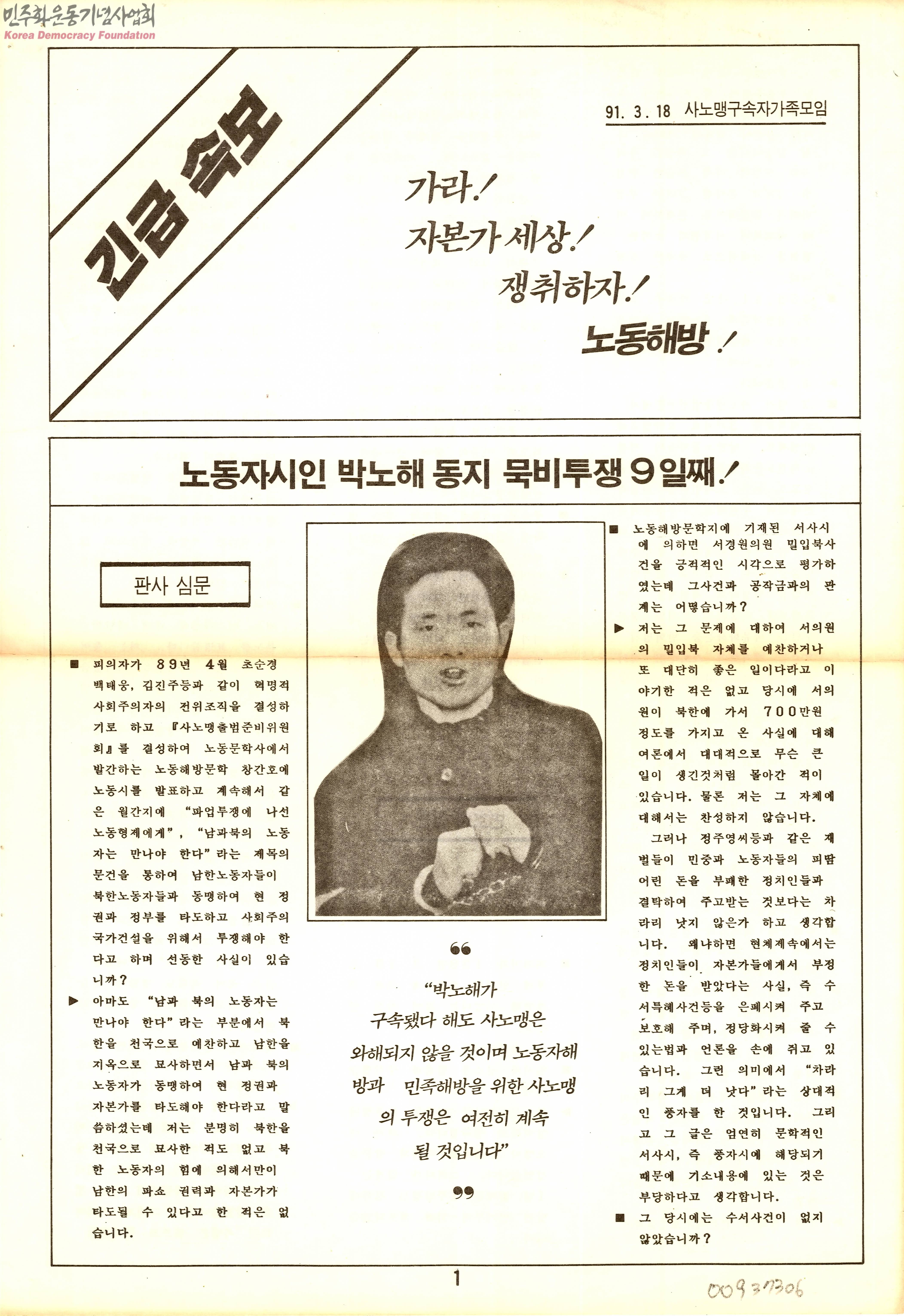 - 노동자 시인 박노해의 묵비투쟁, 판사심문, 변호사 심문 내용을 담고 있는 문서