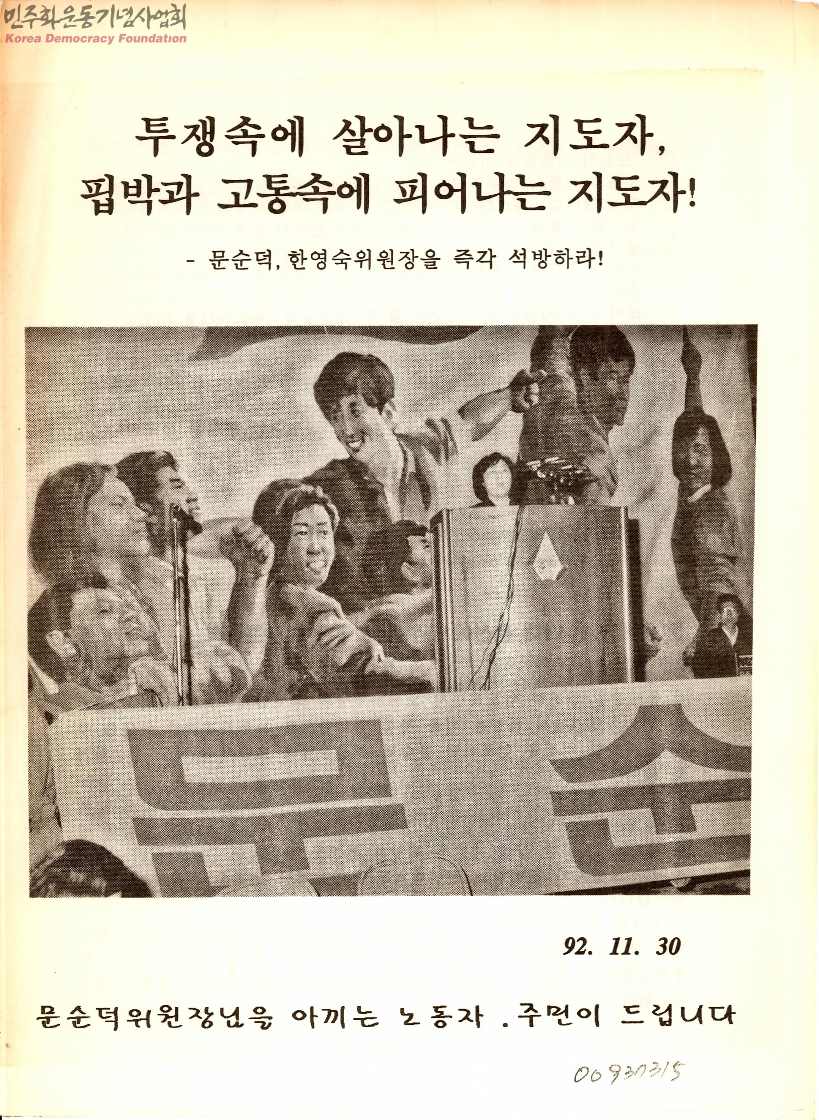 - 파쇼정권에 대항하는 노동운동 지도자 문순덕, 한영숙 위원장을 즉각 석방하라고 요구하는 유인물