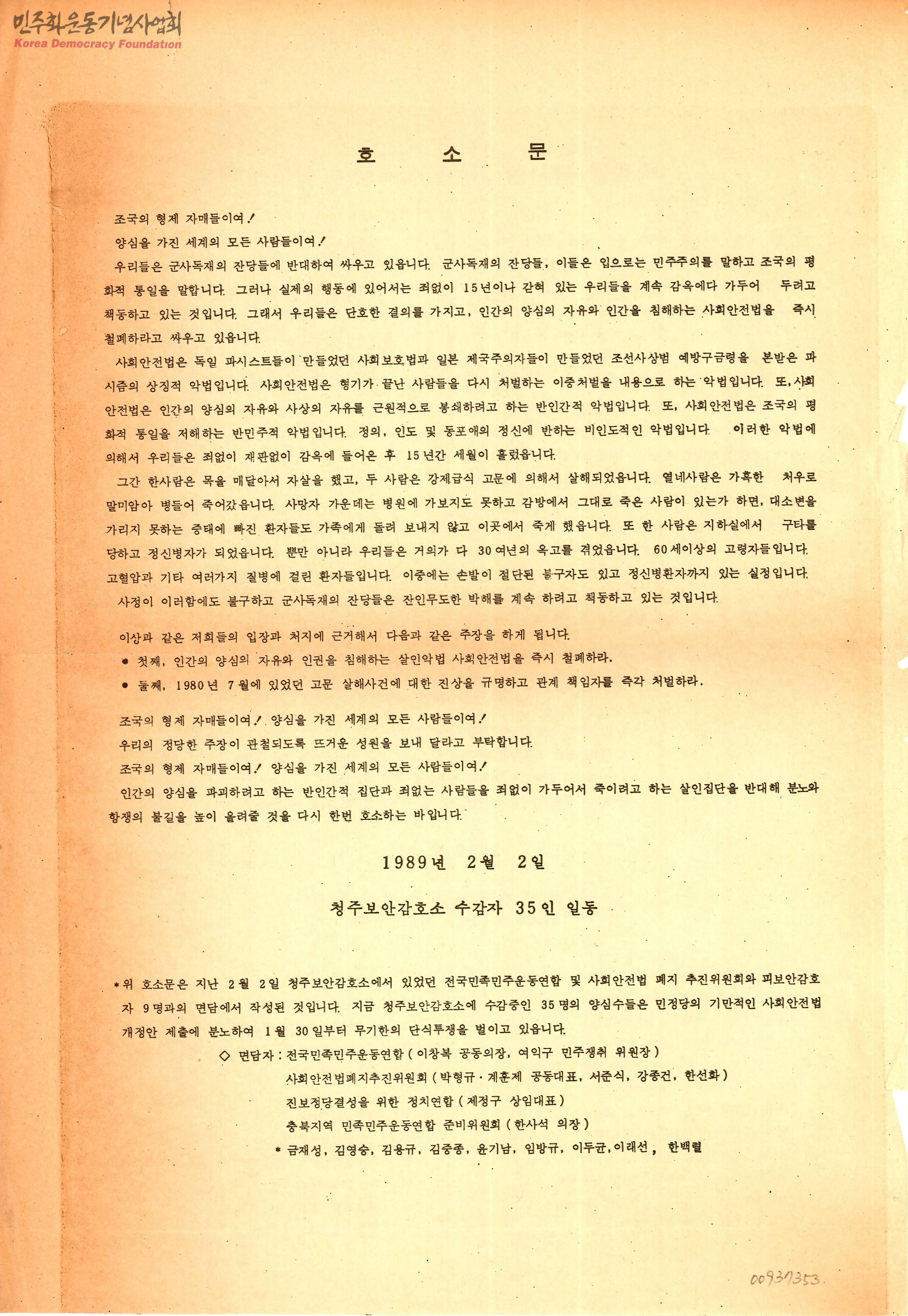 - 사회안전법은 사회보호법과 조선사상법 예방구금령으로 태어난 악법이며 조국의 평화적 통일을 저해하는 법이기 때문에 철폐되어야함을 말하면서 그 법으로 인해 청주감호소 수감자들이 겪고 있는 현실과 인권탄압의 사례들에 대해 기술하고 있고 사회안전법을 제반하는 악법들 철폐와 1980년 7월에 있던 고문 살해사건에 대한 진상규명 및 책임자 처벌을 호소하는 내용