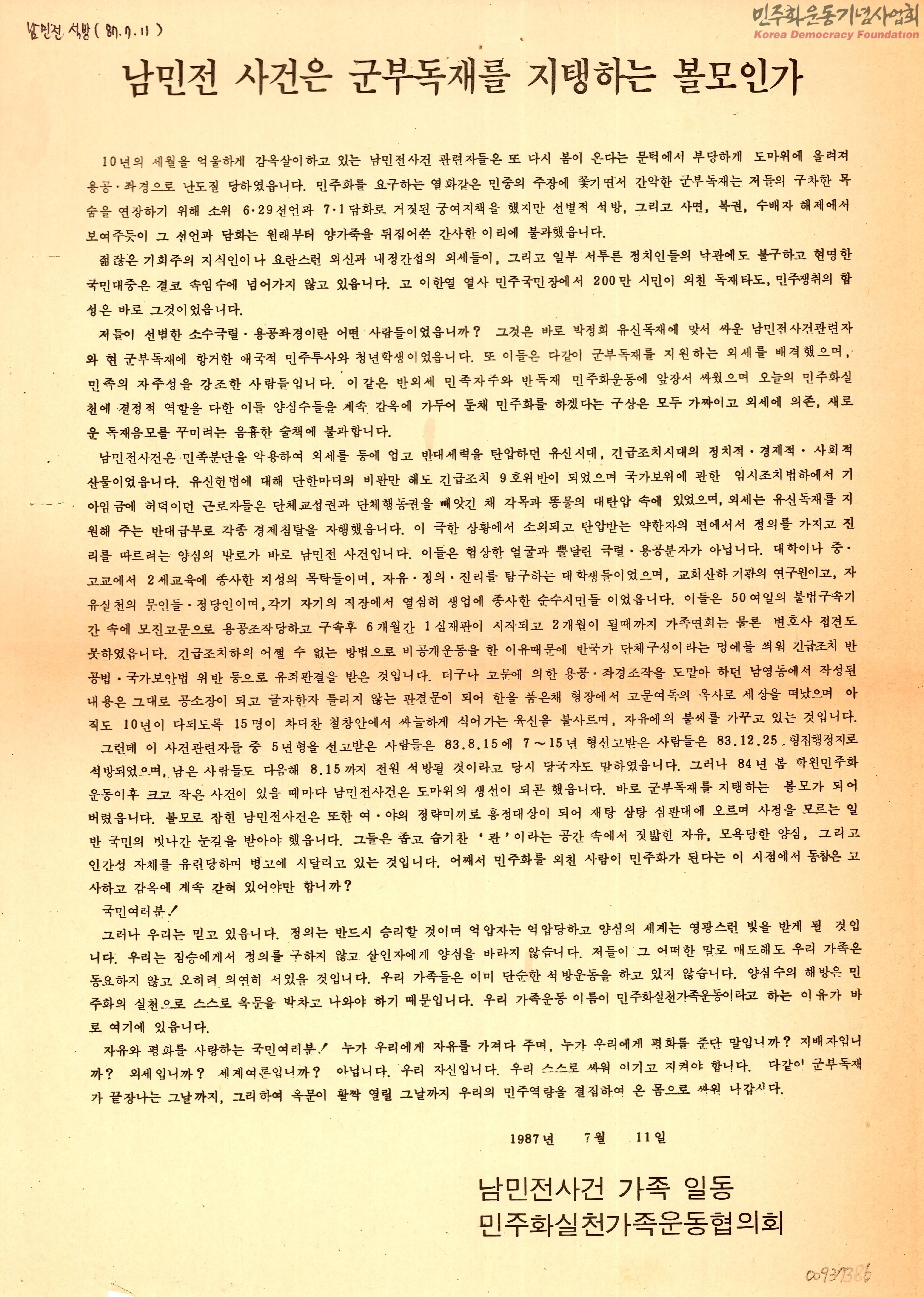 - 남민전사건가족일동;민주화실천가족운동협의회