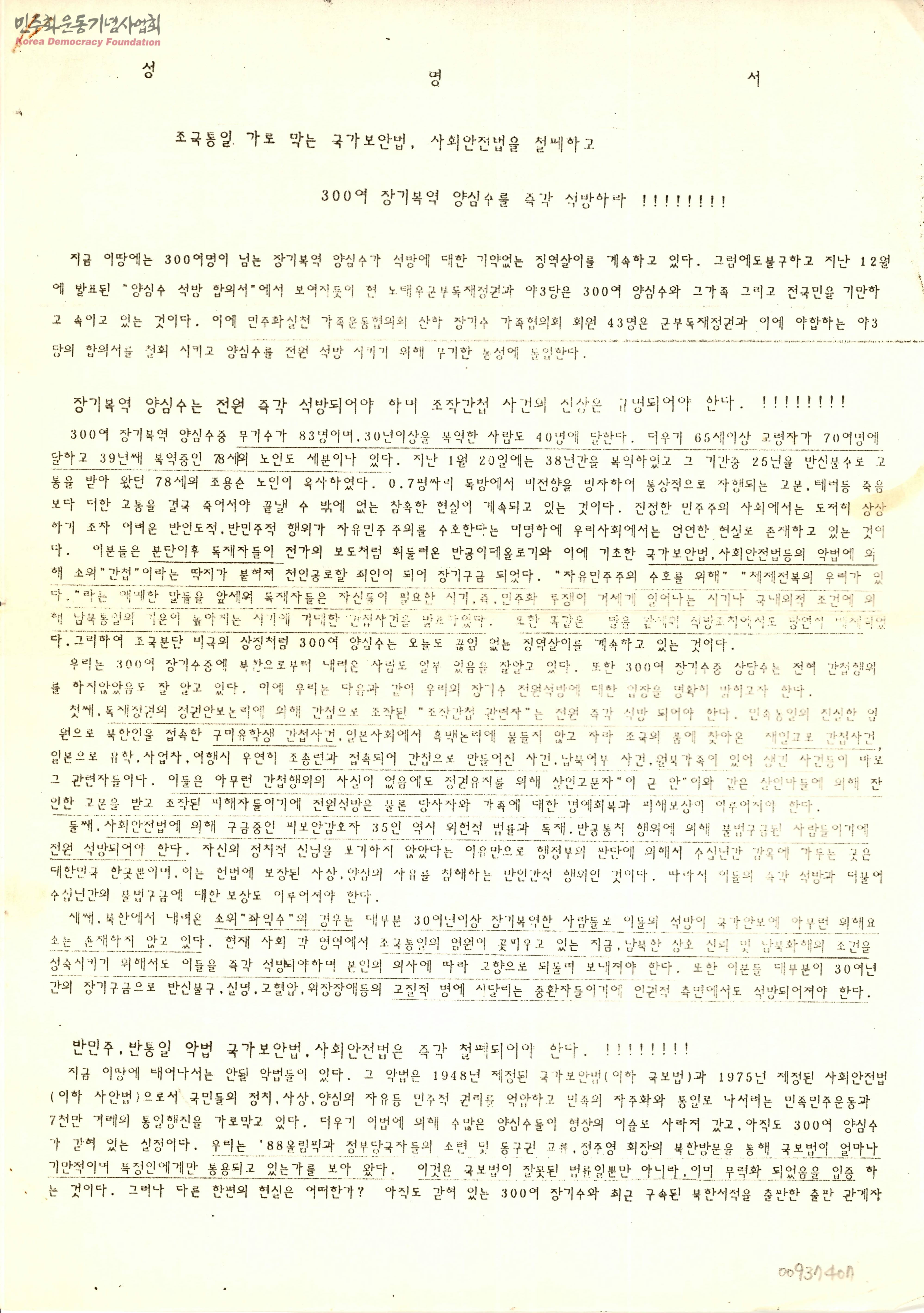 [성명서-조국통일 가로막는 국가보안법, 사회안전법을 철폐하고 300여 장기복약 양심수를 즉각 석방하라!!]