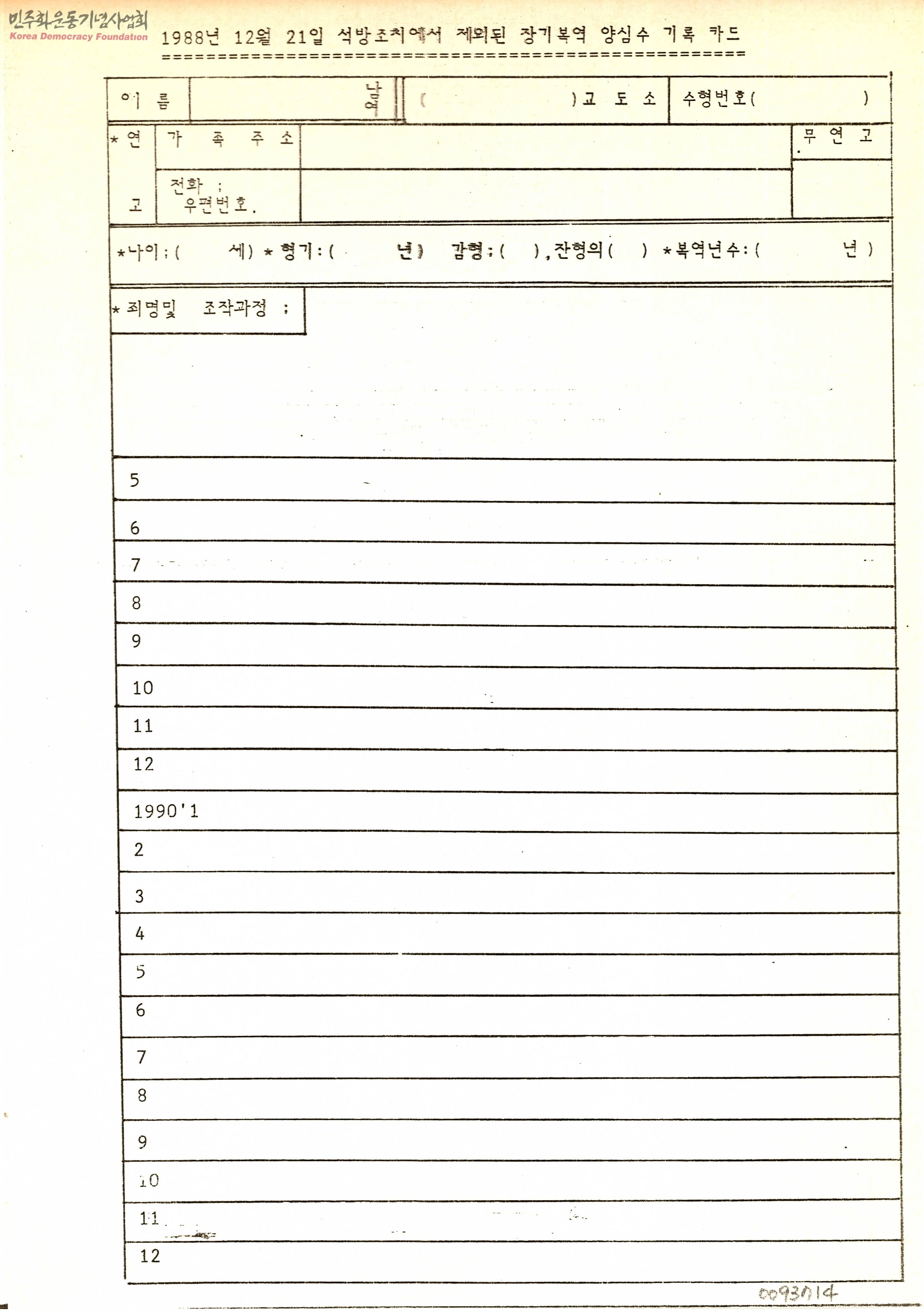 - 1988년 12월 21일 석방조치에서 제외된 장기복역 양심수 기록 카드 형태이자 문서로 이름과 성별, 어디 교도소인지와 수형번호, 연고유무와 나이, 형기와 감형, 죄명 및 조작과정 등을 적을 수 형태의 문서