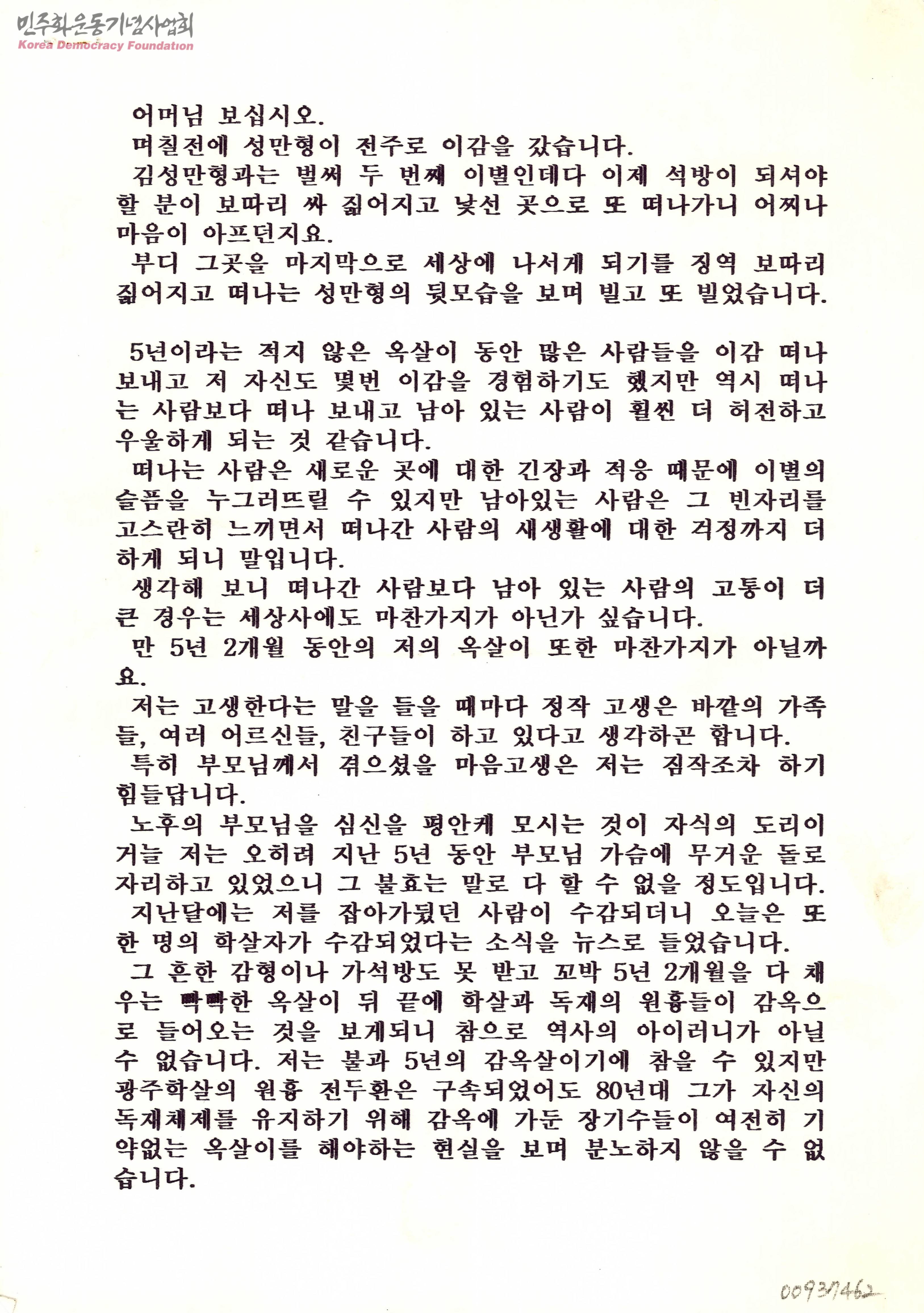 - 수감자가 어머니에게 보내는 편지로 감옥살이를 하면서 느끼는 힘든 점과 동지들이 이감되고 나서의 허탈감, 옥에 있어 효도를 하지 못하는 것에 불효로써의 죄송함과 자신을 가둔 독재자들에 대한 분노 등을 내용으로 담고 있고 모든 장기수들의 석방을 희망하고 풀려날 때까지 투쟁하겠다는 의지를 담은 내용