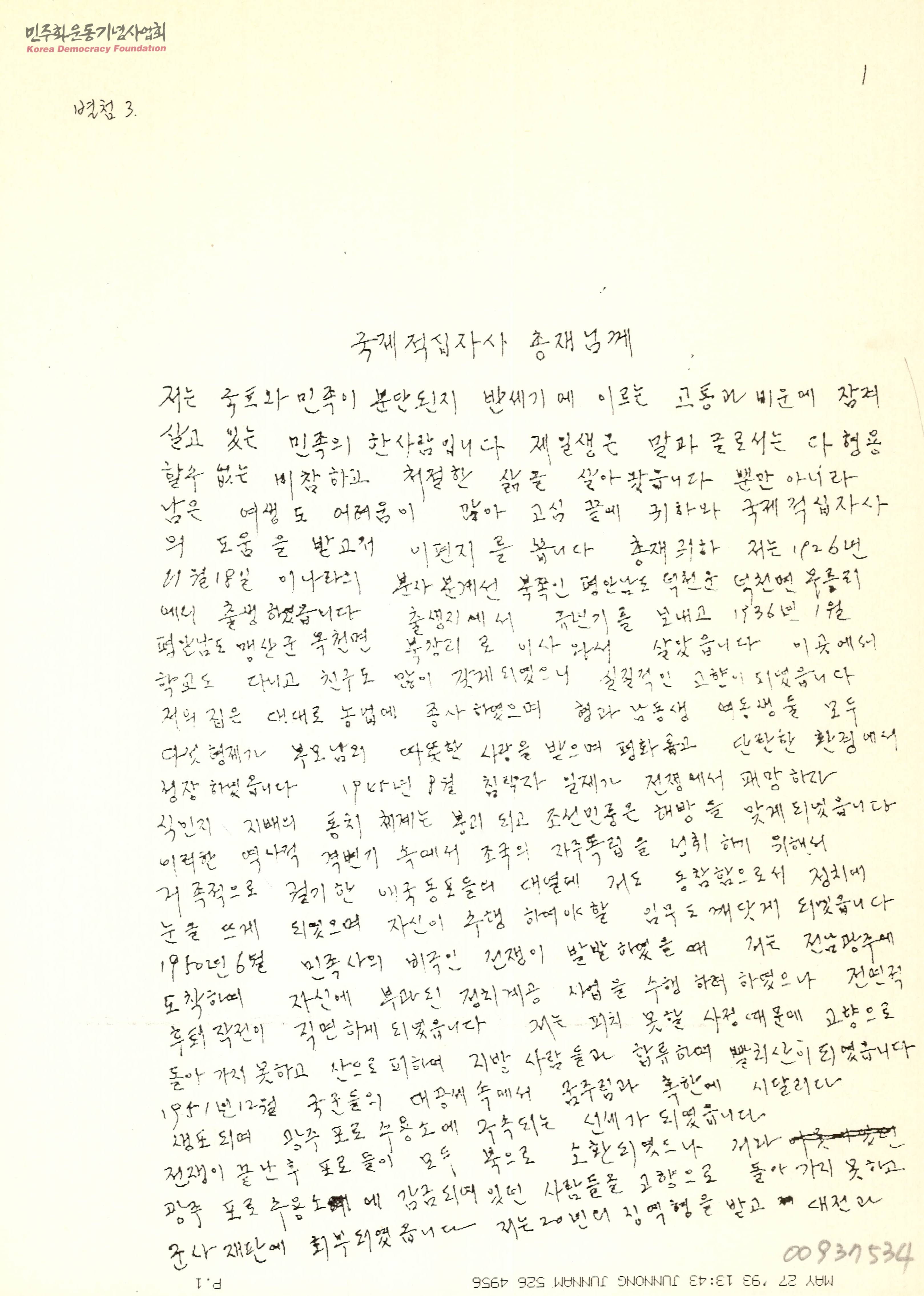 - 자신이 자라온 환경과 어린시절의 기억, 남으로 내려 오게 된 이유와 현재의 상황을 설명하며 북으로 돌아가기 위해 적십자사 총재에게 도움을 요청하는 내용을 글