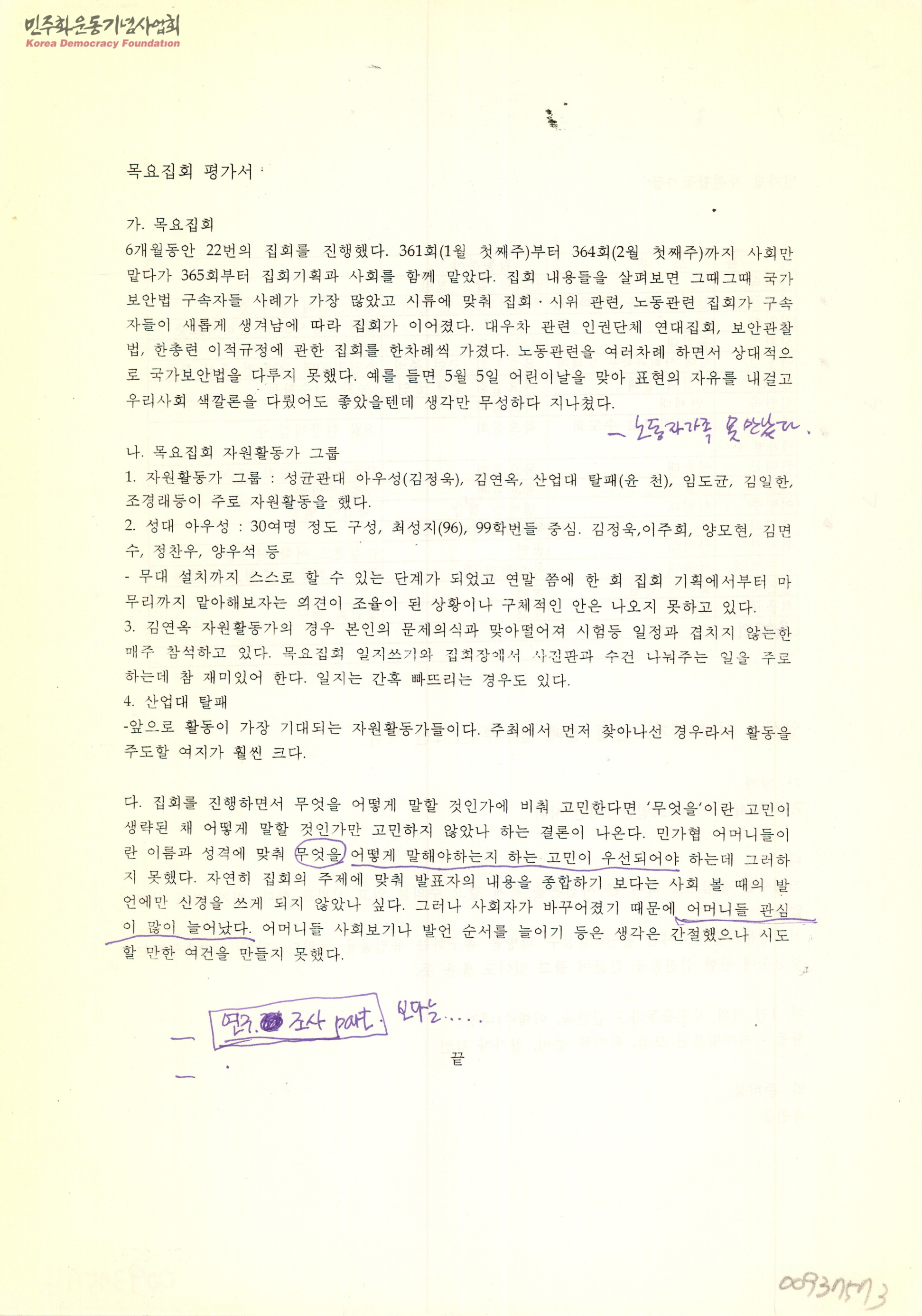 - 22번의 목요집외에 대한 평가와 목요집화 자원활동가 그룹, 집회 개선방향에 대한 내용