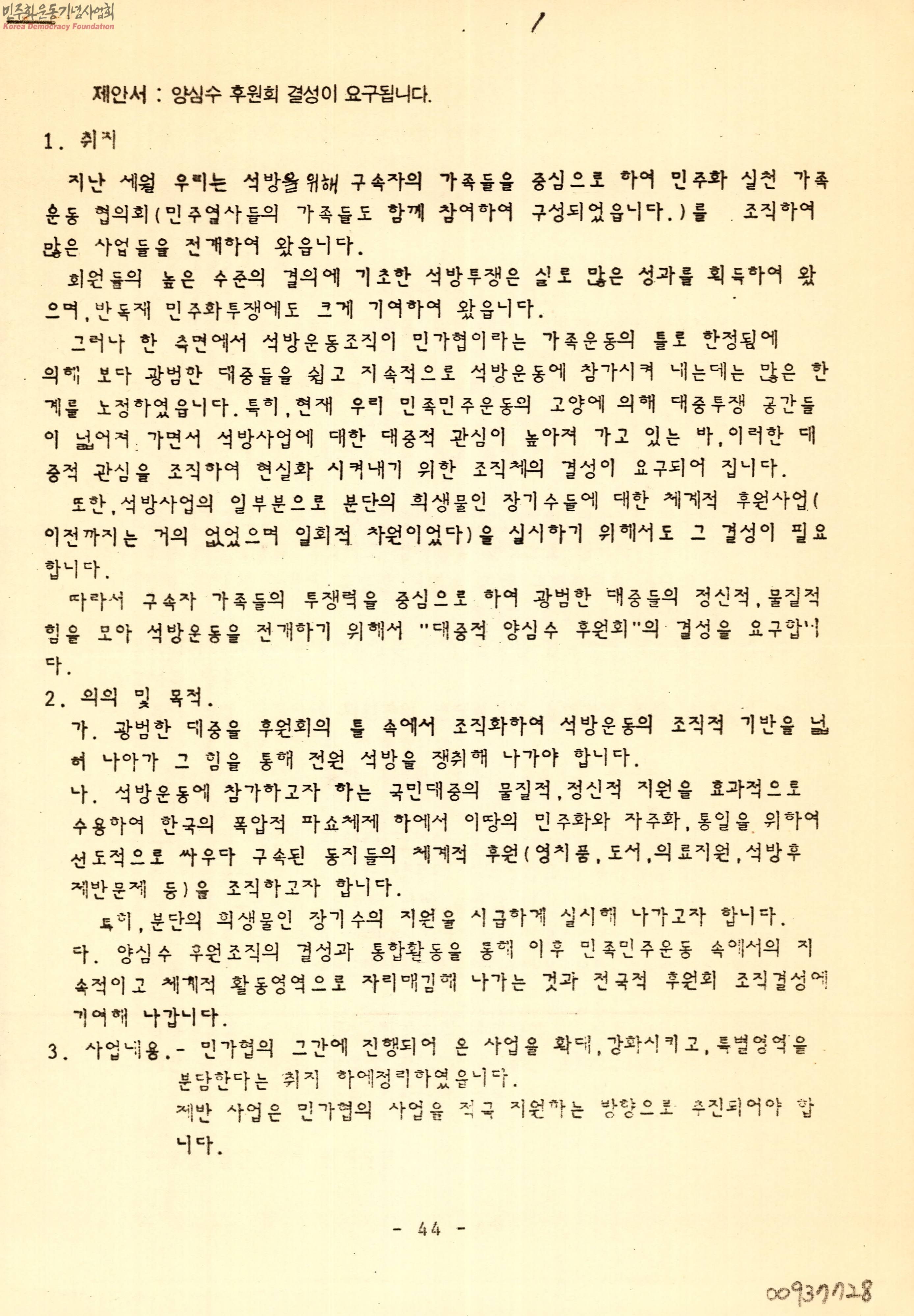 - 양심수 후원회 결성의 취지, 의의, 목적과 사업 내용의 계획안 및 1차문건에 대한 보완서와 준비위원회 1차모임의 식순이 포함된 문서.