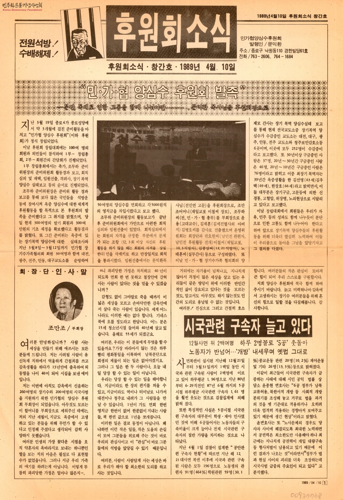 - 민가협 양심수 후원회가 발족해 문익환 목사가 후원회장이 되었으며 자유와 민주의 성과를 함께 나누듯 분단으로 인한 고통도 함께 나누어야 한다고 말하며 양심수 후원활동에 박차를 가해 우리품으로 돌아올 날을 앞당기자고 결의하는 내용이 담긴 소식지.