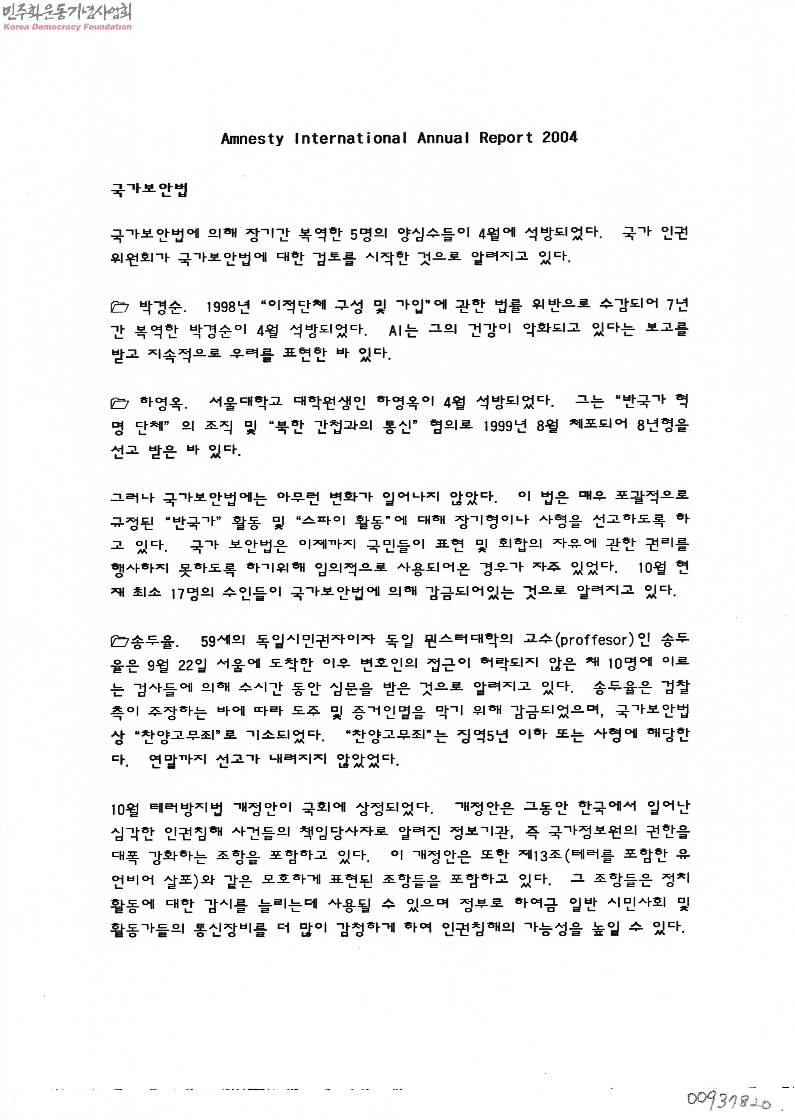 - 국가보안법에 의해 장기간 복역한 양심수들에 대한 설명이 적힌 낱장 문서.