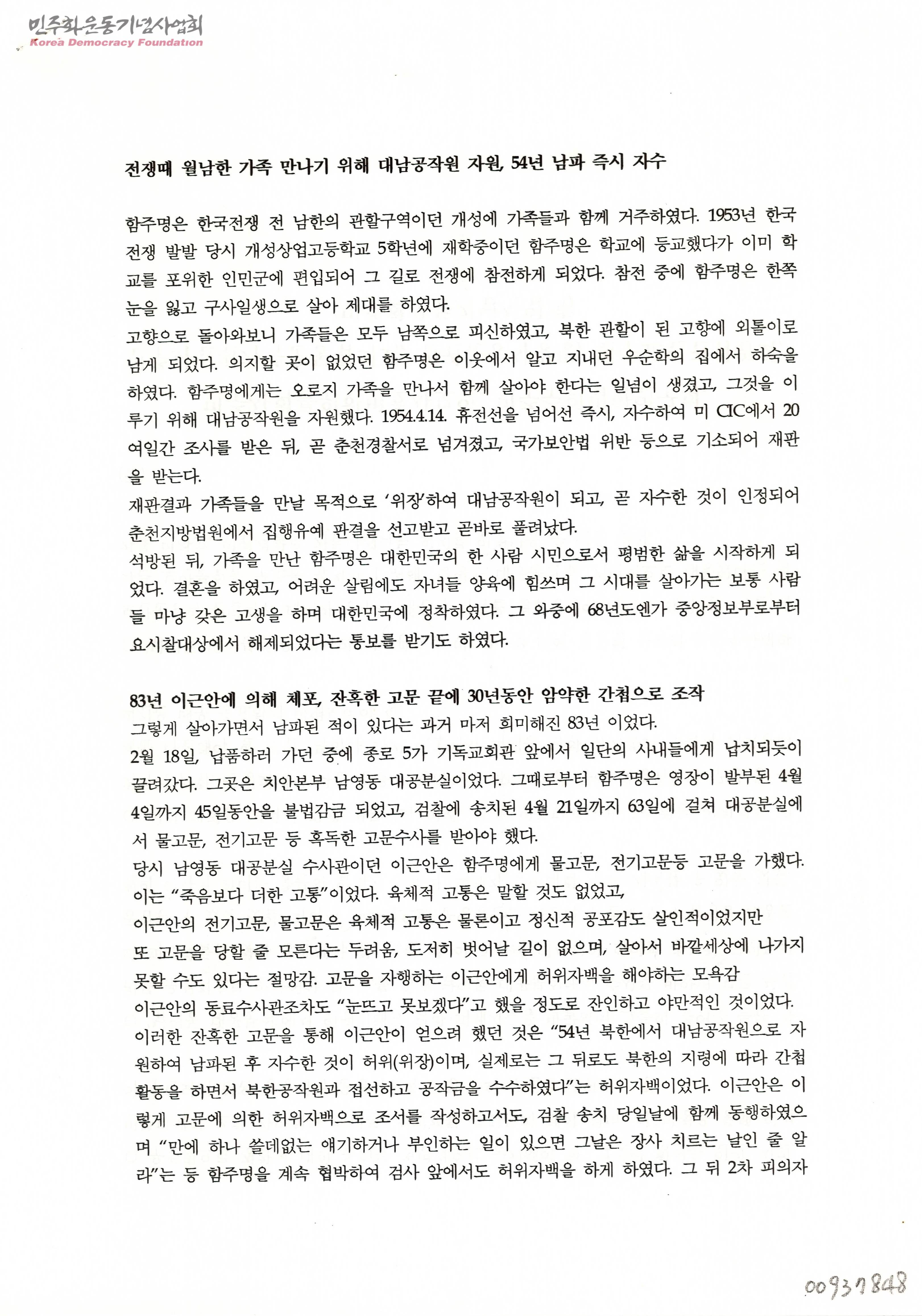- 남영동 대공분실에서 간첩으로 만들어진 함주명씨의 무죄선고 까지의 인생 일대를 기술한 내용의 문서.