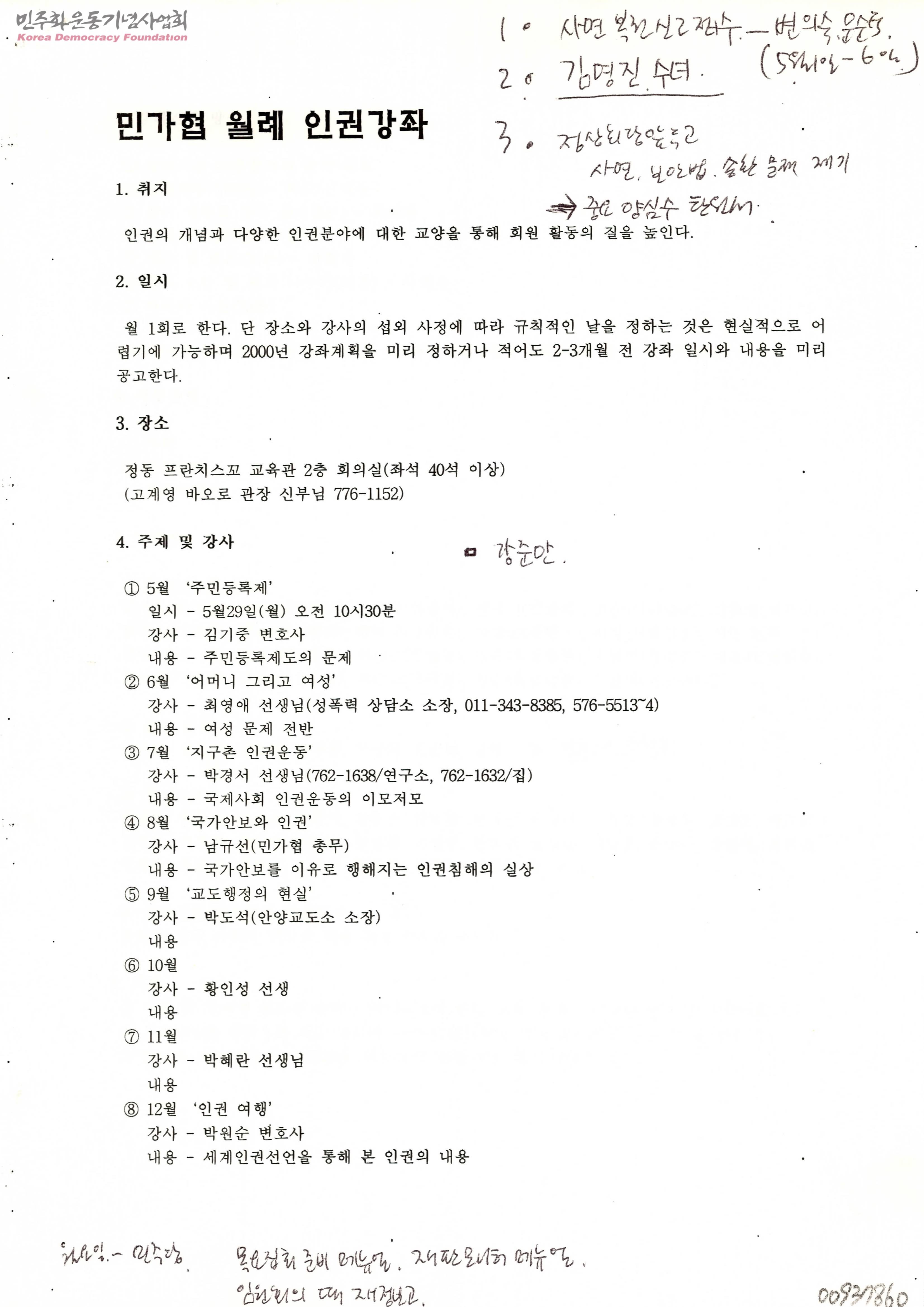 - 민가협 월례 인권강좌의 취지와 일시 및 장소 등에 관한 정보를 포함하고 월별 강좌주제와 강사에 대한 내용이 담긴 문서.