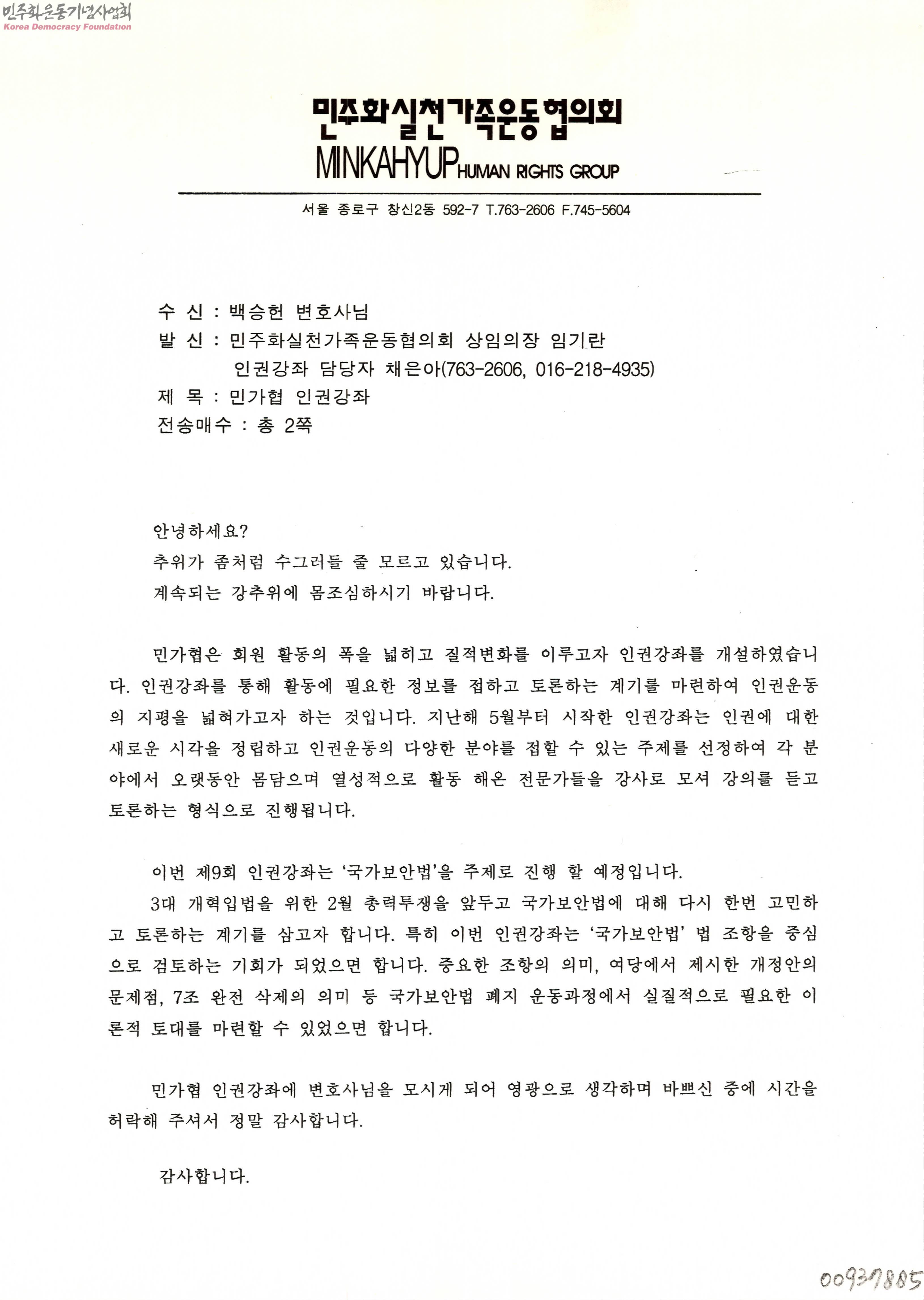 민가협 제9회 인권강좌 강사 요청 공문[수신:백승헌 변호사, 발신:민주화실천가족운동협의회]