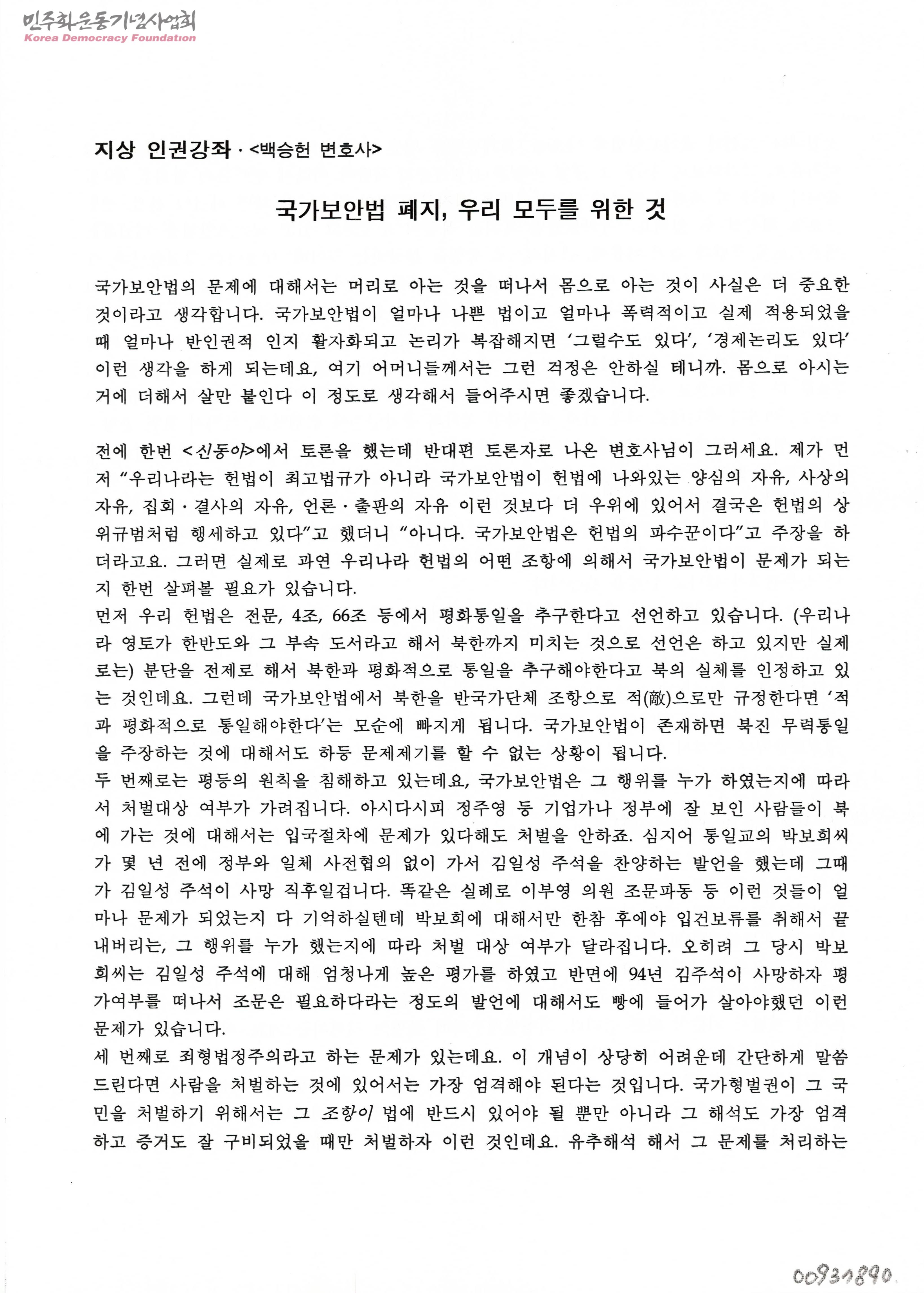 - 국가보안법 폐지를 주제로 한 백승헌 변호사의 제9회 인권강좌 내용을 문서화한 자료.