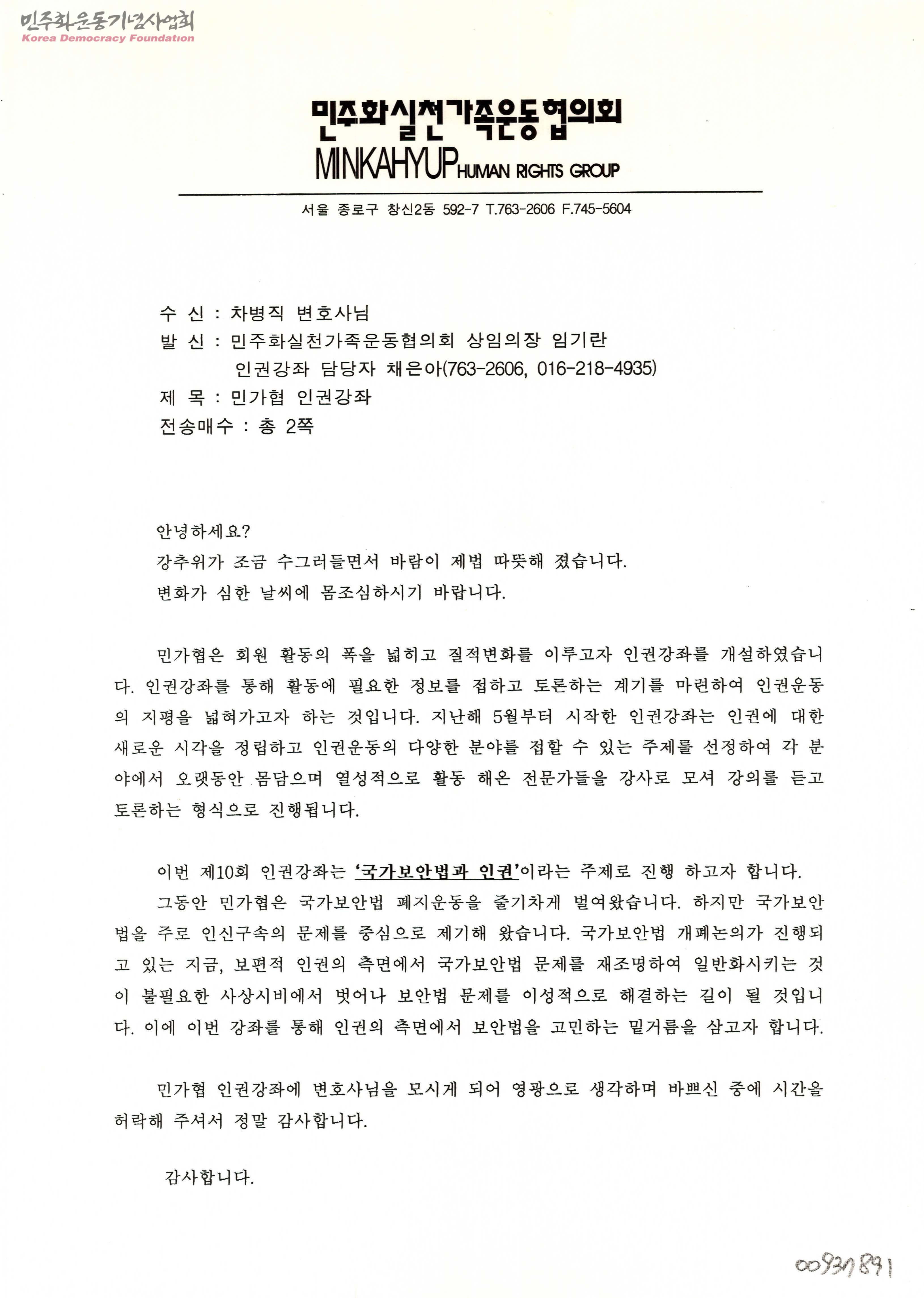 민가협 제10회 인권강좌 강사 요청 공문 [수신:차병직 변호사, 발신:민주화실천가족운동협의회]