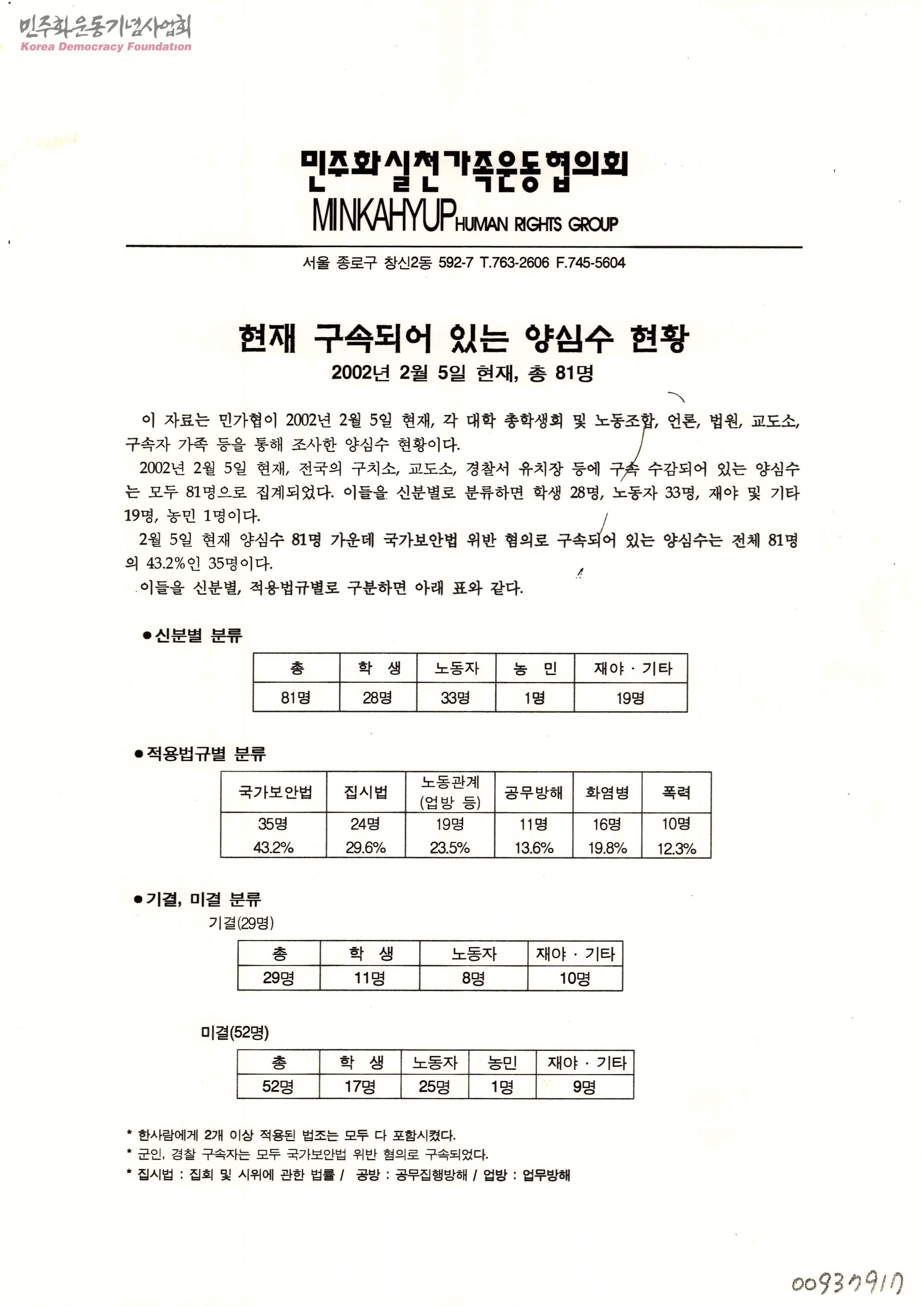 - 구속되어 있는 양심수의 현황을 신분 및 적용 법규별로 분류하고 있으며 기결과 미결 건으로 분류된 양심수의 소속과 사건명 등에 대한 정보가 포함된 문서.