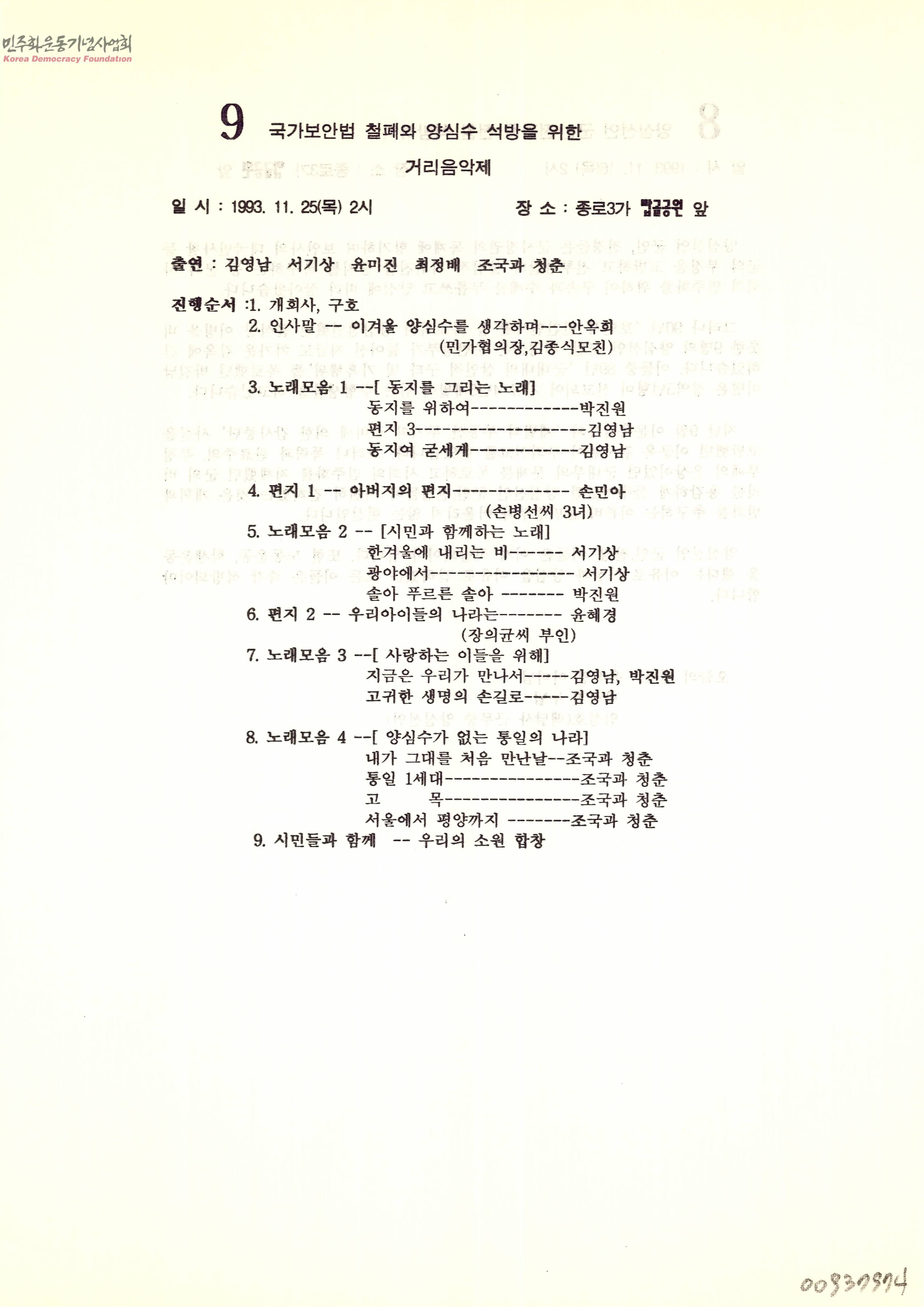 - 국가보안법 폐지와 양심수 석방을 위한 거리음악제의 개요와 출연자를 소개하며 진행순서에 대해 안내하는 내용의 문서.