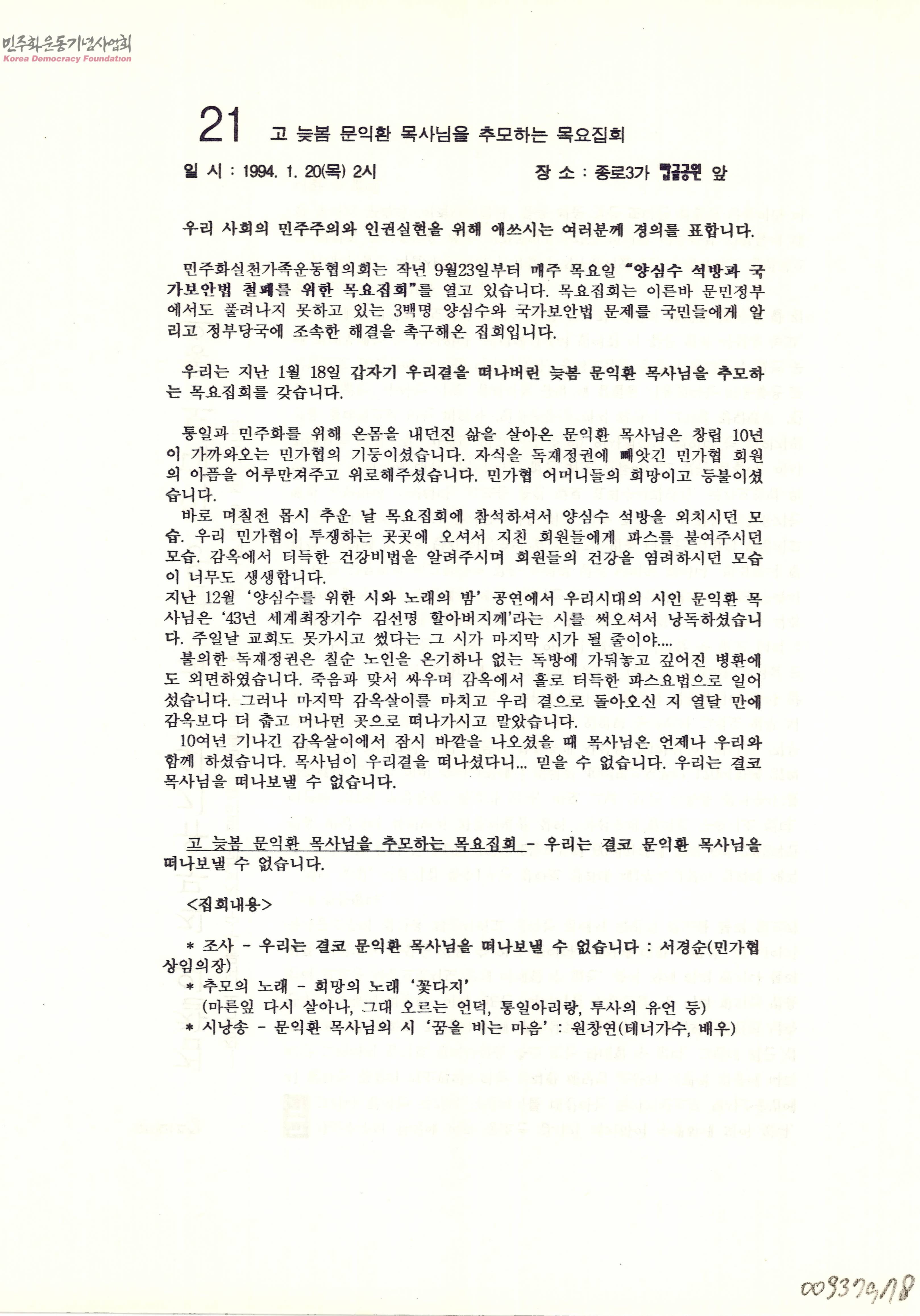 - 문익환 목사를 추모하는 목요집회를 안내하는 내용의 문서이며 출연자와 집회순서에 대한 정보가 포함됨.