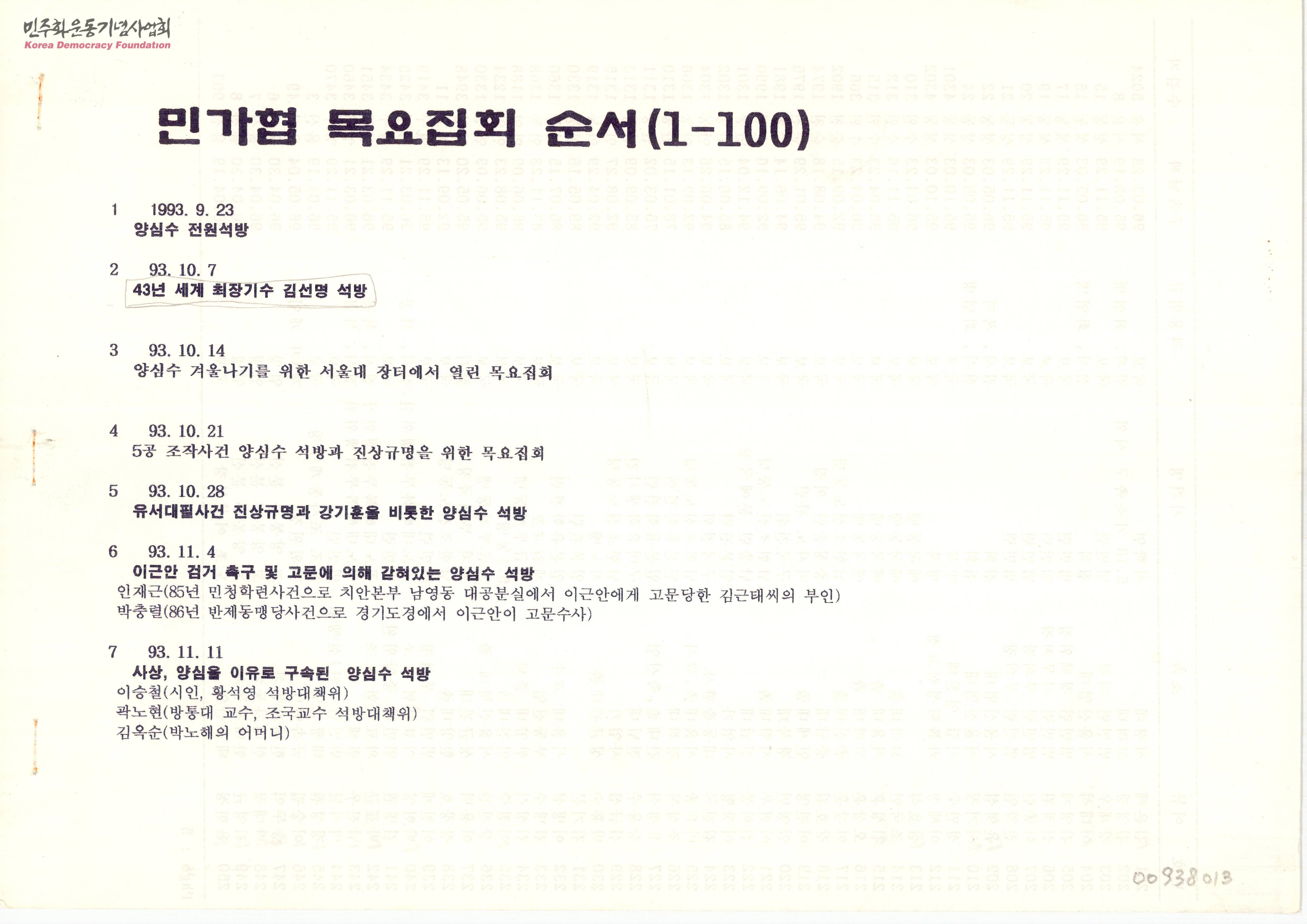 - 1993년 9월부터 1995년 8월까지 총 100회의 민가협 목요집회의 일자와 주제및 출연자가 나열된 목록.