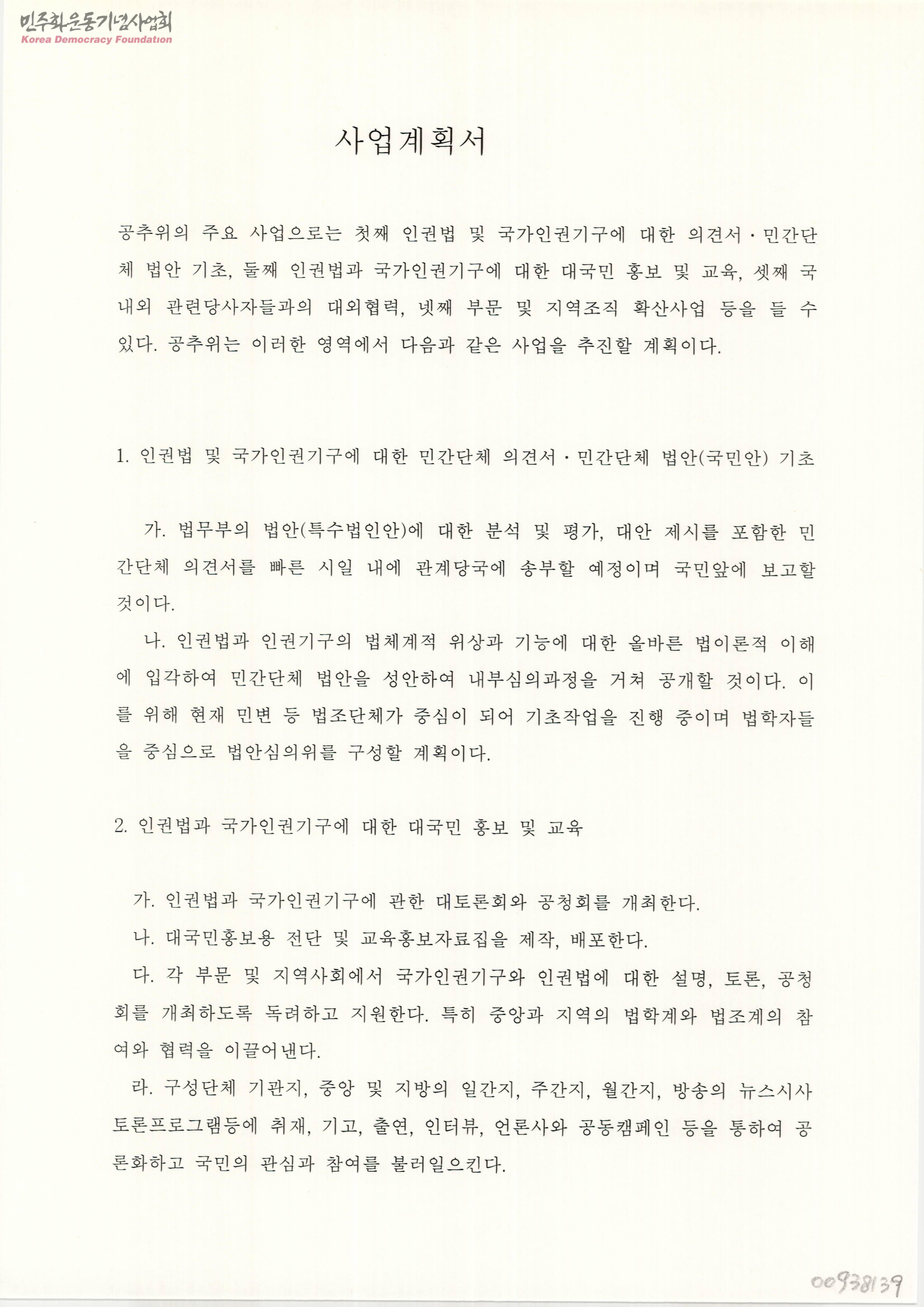 - 인권법 및 국가인권기구에 대한 민간단체 의견서와 법안을 작성하고 대국민 홍보 및 교육등의 공추위의 주요 사업 활동을 계획하는 내용의 문서.