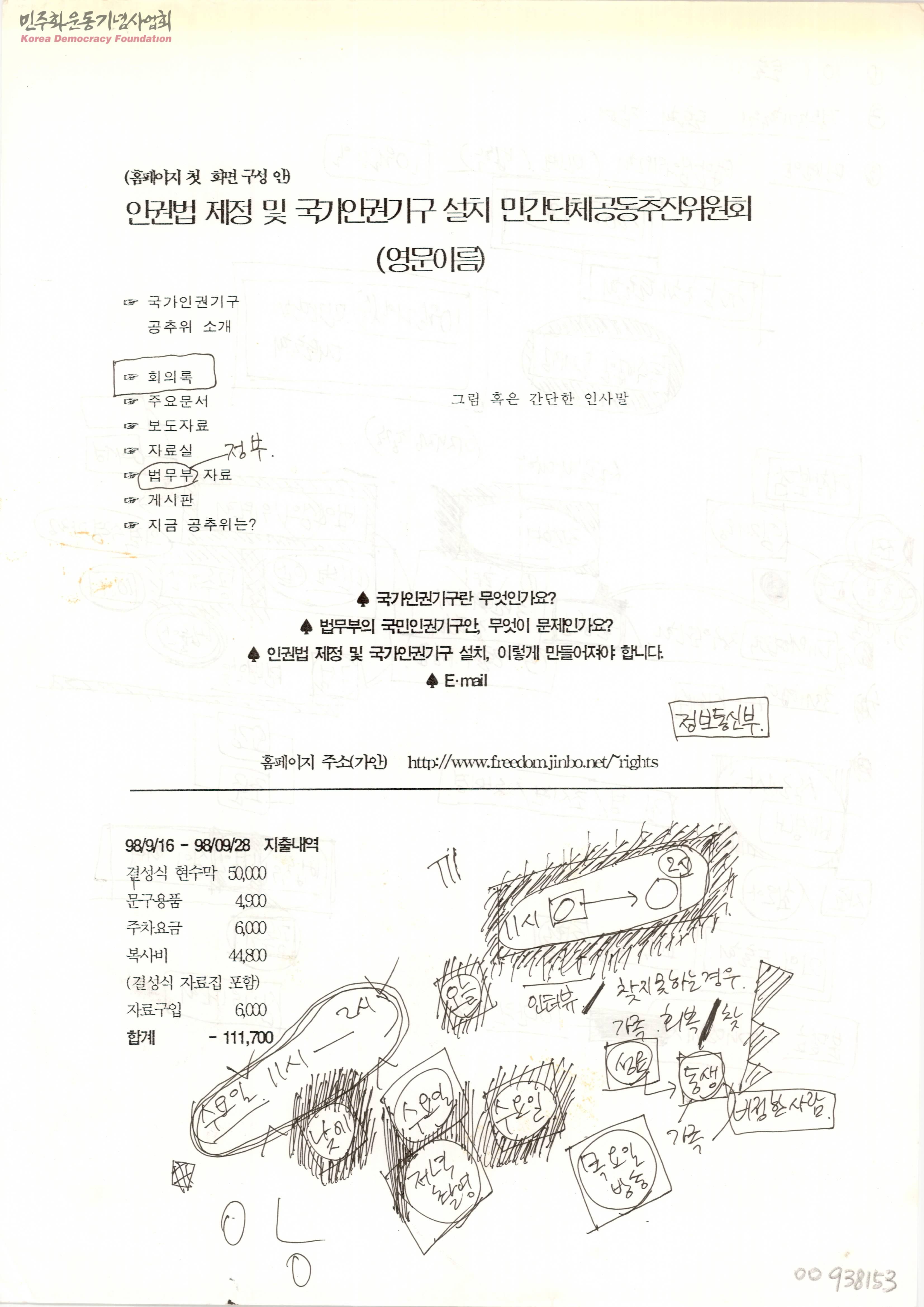 - 인권법 제정 및 국가인권기구 설치 민간단체공동추진위원회 홈페이지 화면 구성안과 결성식 관련 지출내역이 포함된 문서.