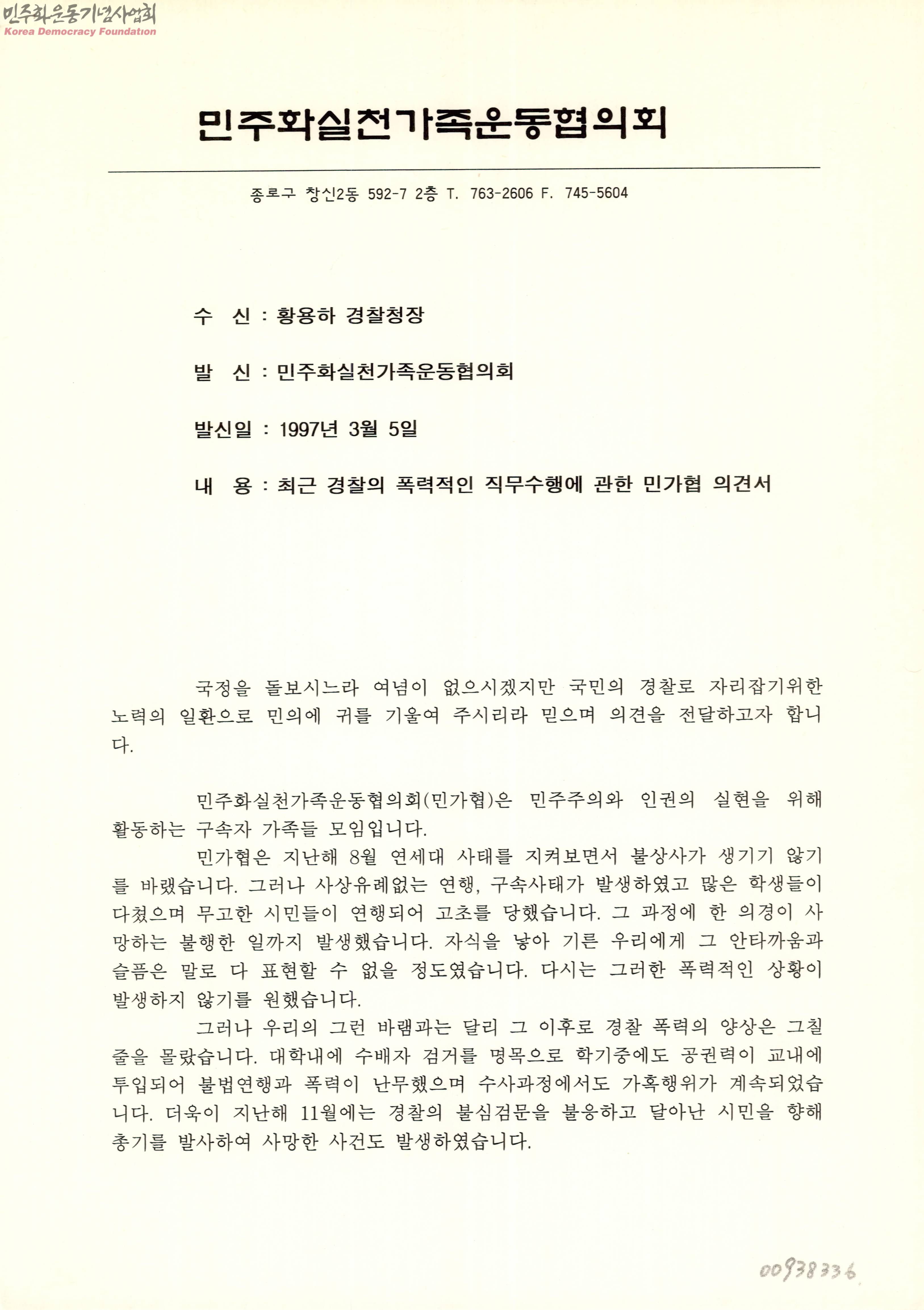최근 경찰의 폭력적인 직무수행에 관한 민가협 의견서