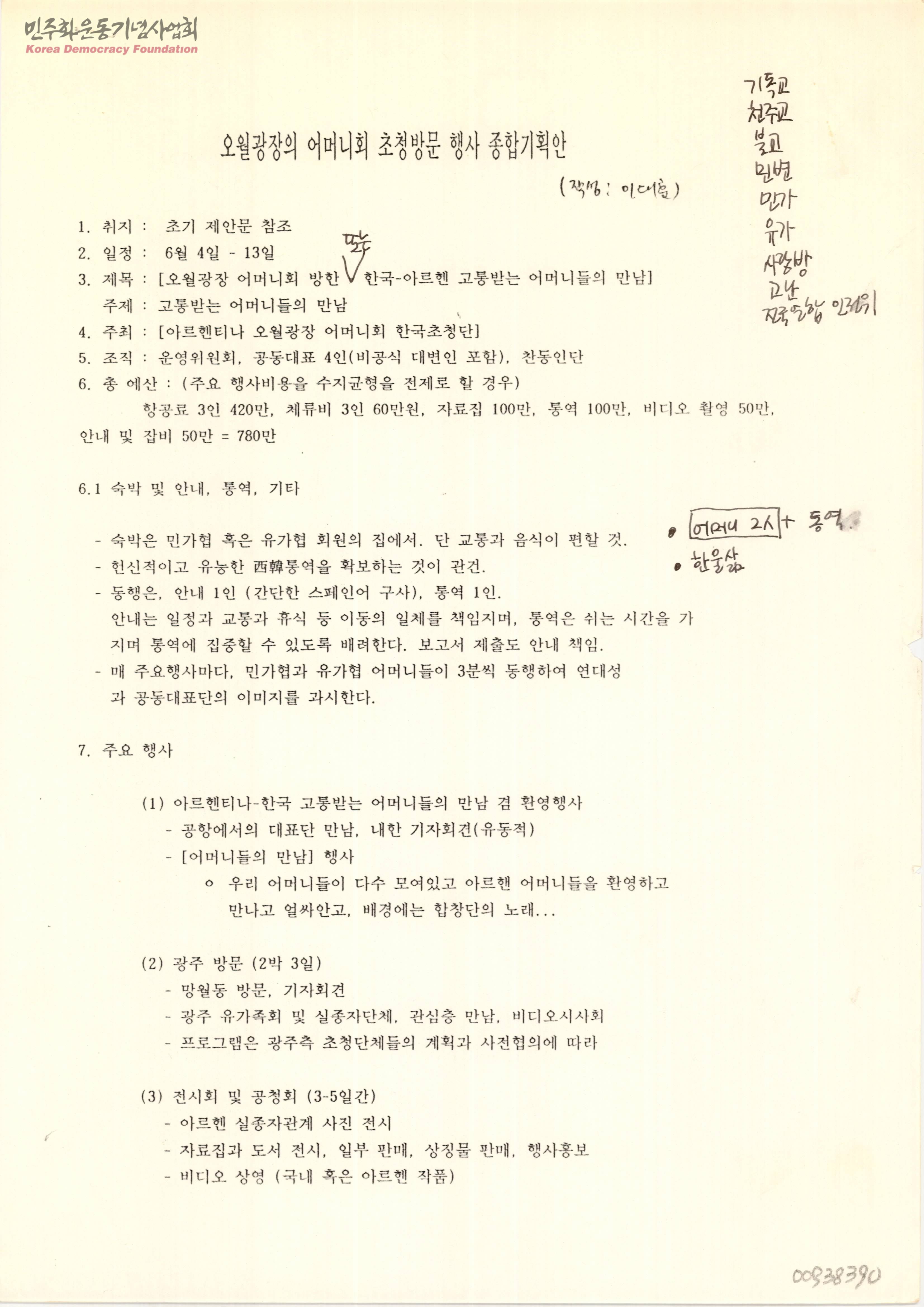 - 아르헨티나 오월광장 어머니회 한국초청단에서 주최하는 행사 일정 및 예산 등 전반적인 종합기획안