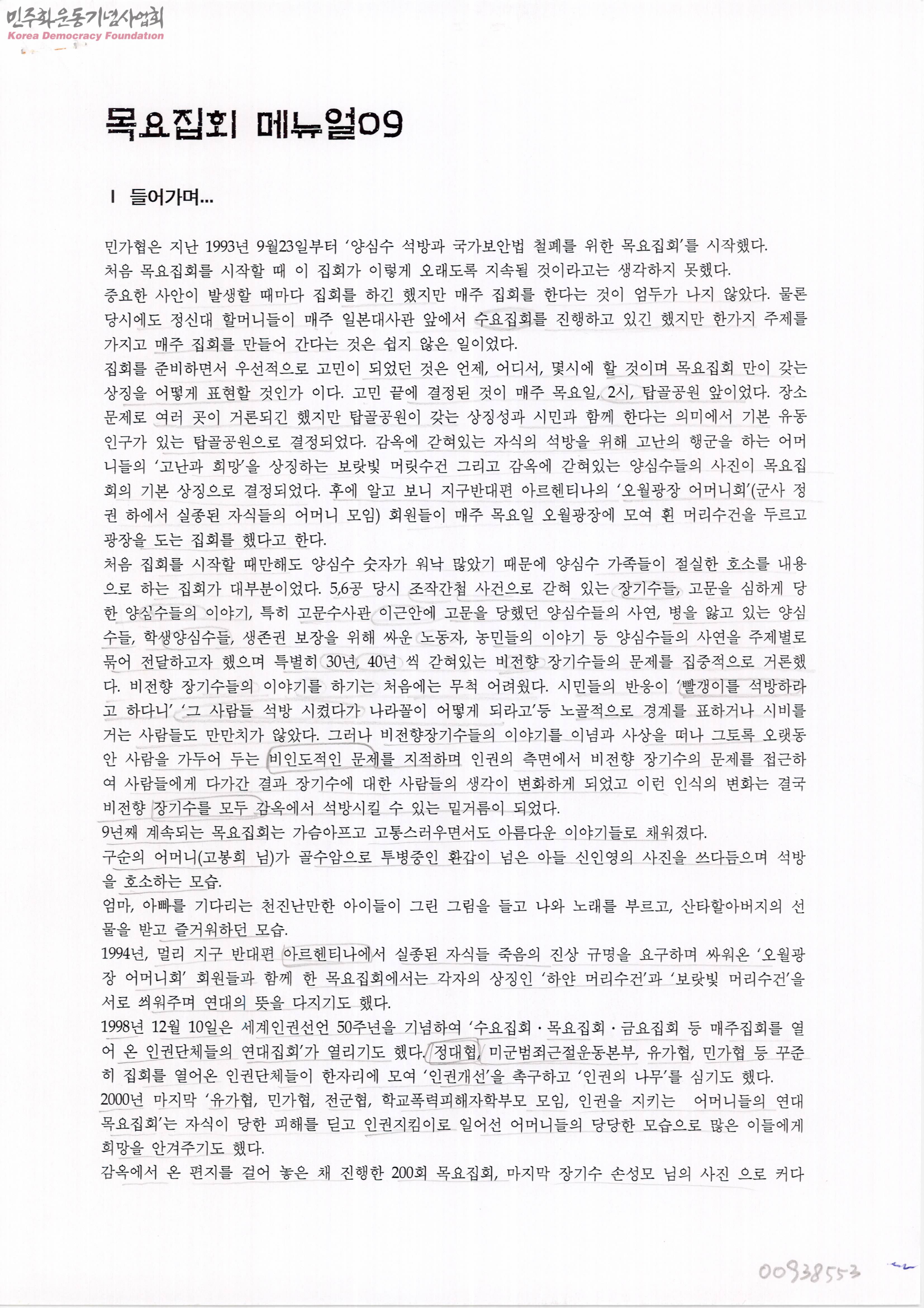 - 국가보안법 철폐와 양심수 전원 석방을 촉구하며 매주 목요일에 진행되는 민가협 주최의 목요집회에 관한 매뉴얼을 담은 문서