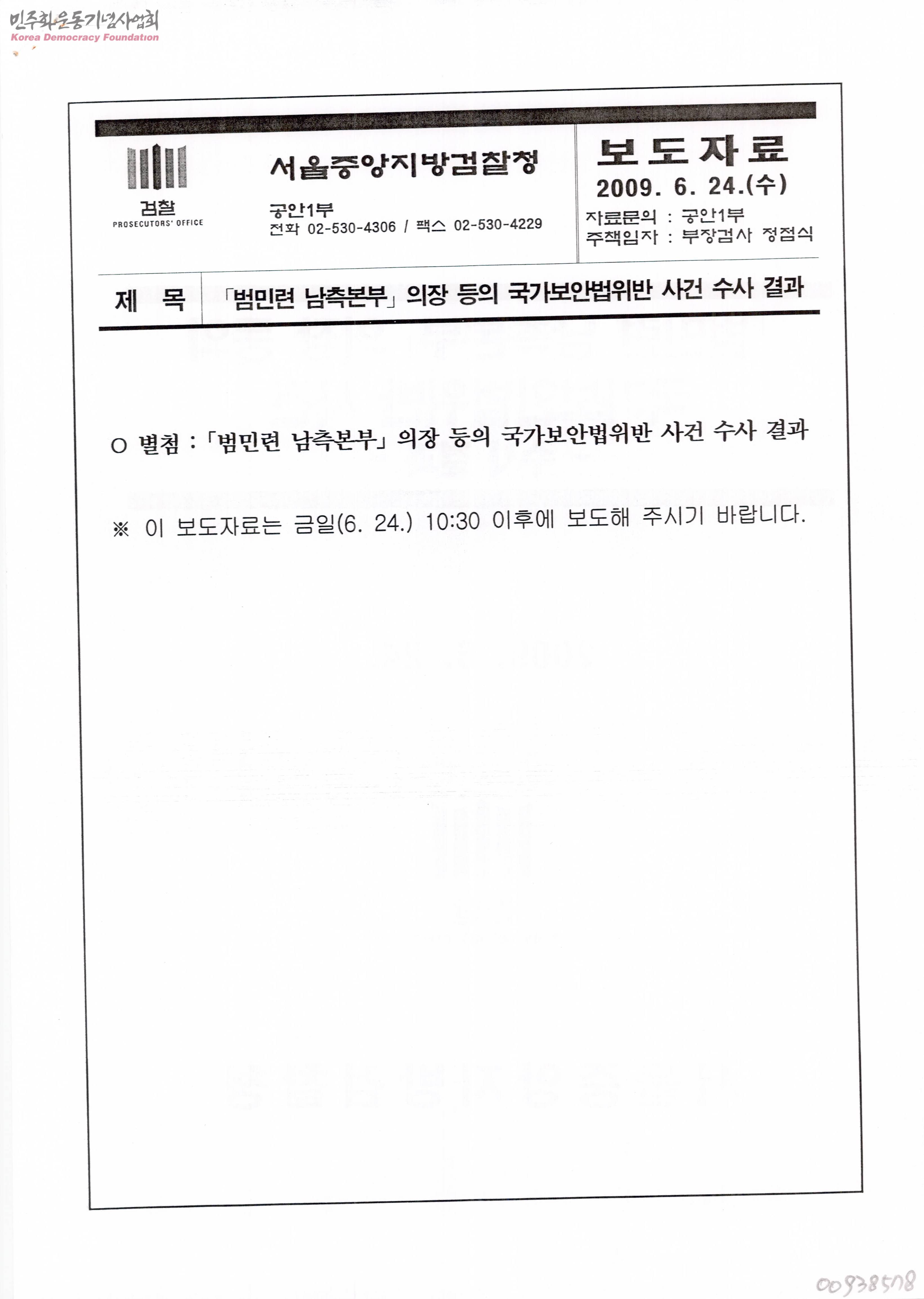 - 북한의 대남혁명노선에 따라 친북정권 수립을 통한 통일이라는 목표 아래 각종 실천투쟁을 전개하여 이적단체로 규정된 조국통일범민족연합에 대한 구속 기소 사실과 공소요지를 담은 보도자료.